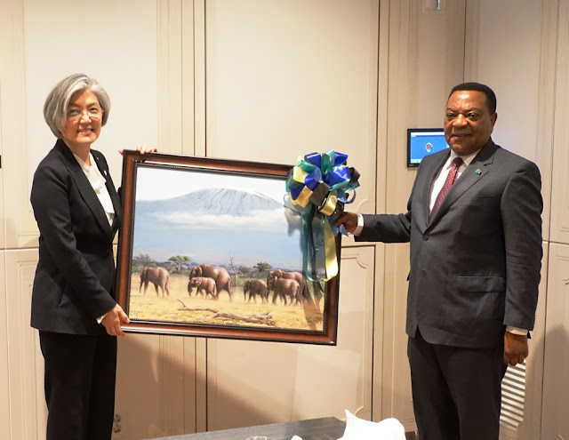 Mheshimiwa Dkt. Augustine Mahiga, Waziri wa Mambo ya Nje wa Tanzania akimkabidhi zawadi ya picha ya mlima Kilimanjaro na kinyago cha mnyama waziri mwenzake wa Jamhuri ya Korea Mheshimiwa Kang Kyung-hwa baada ya kukamilisha mazungumzo ya kikazi yanayolenga kuimarisha uhusiano wa kidiplomasia na uchumi baina ya nchi hizo mbili.