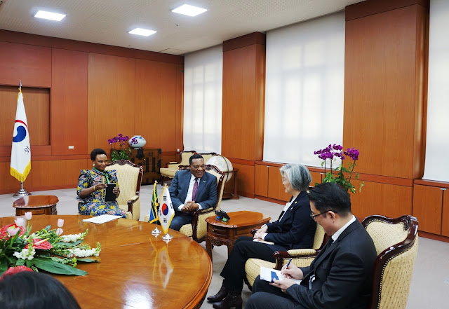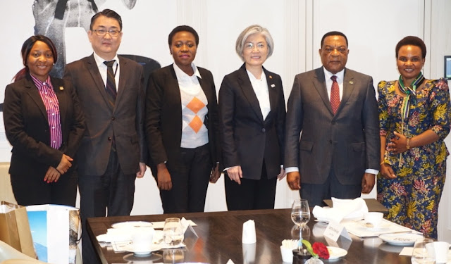 Mawaziri wa Mambo ya Nje wa Jamhuri ya Muungano wa Tanzania na Jamhuri ya Korea wakiwa kwenye picha ya pamoja baada ya kukamilisha mazungumzo ya kikazi. Wakwanza kulia ni Mheshimiwa Balozi Matilda Masuka, Balozi wa Tanzania nchini Korea Kusini, Bi. Bertha Makilagi, afisa dawati wa Korea Kusini, Wizara ya Mambo ya Nje, Bw. Park Young min, Mkurugenzi Mkuu wa Idara ya Afrika, Wizara ya Mambo  ya Nje ya Korea Kusini na Bi. Mindi Kasiga, Mkuu wa Kitengo cha Mawasiliano ya Serikali na Msemaji wa Wizara ya Mambo ya Nje na Ushirikiano wa Afrika Mashariki.