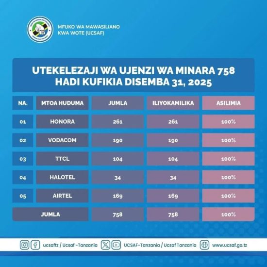 Na Mwandishi Wetu Serikali kupitia Mfuko wa Mawasiliano kwa Wote (UCSAF) imekamilisha ujenzi wa minara yote 758 kati ya 758, mradi mkubwa wa kimkakati uliotekelezwa kwa kipindi cha takribani miaka miwili kwa lengo la kupanua upatikanaji wa huduma za mawasiliano…