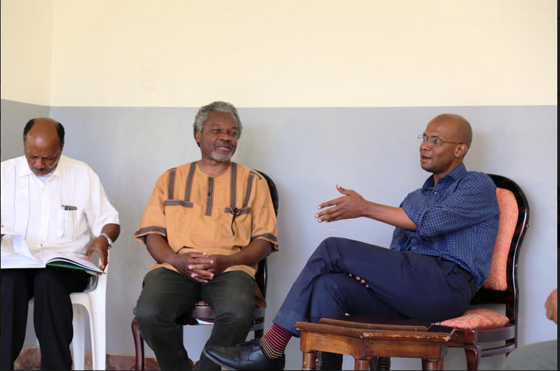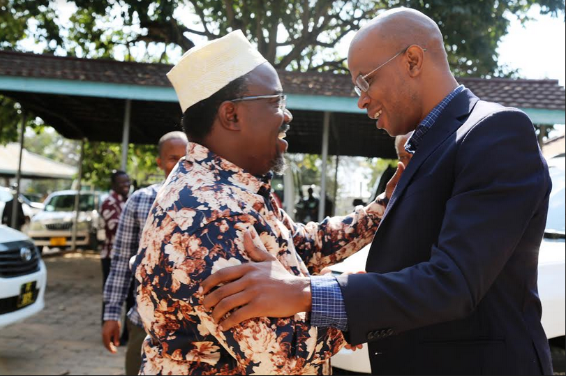 Waziri wa Nchi ofisi ya Makamu wa Rais Muungano na Mazingira Mhe. January Makamba (kulia) akizungumza na Bw. Madaraka Nyerere mara baada ya kutembelea katika makazi ya Hayati Mwl. Julius Nyerere Wilayani Butiama na kuona namna ya kuhifadhi msitu wa Mwalimu kwa Sheria ya Mazingira ya mwaka 2004.