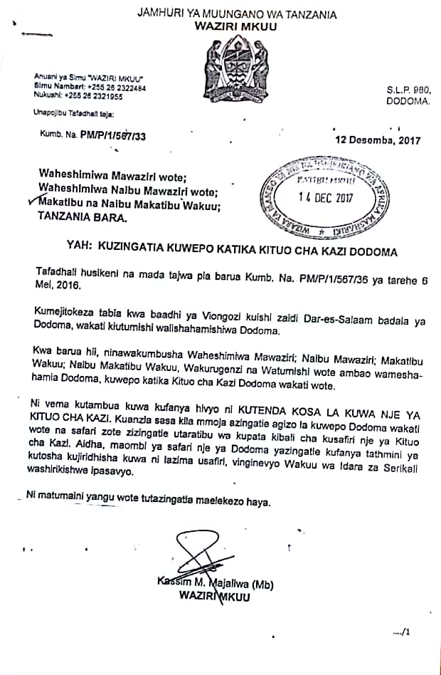 Disemba 12 mwaka huu, Waziri Mkuu wa Jamhuri ya Muungano wa Tanzania aliandika barua kwenda kwa Mawaziri, Manaibu Waziri, Wakurugenzi na watumishi wengine wa serikali ambao hawakai kwenye vituo vyao vya kazi kwa mujibu wa sheria, hatua za kisheria zitachukuliwa dhidi yao.