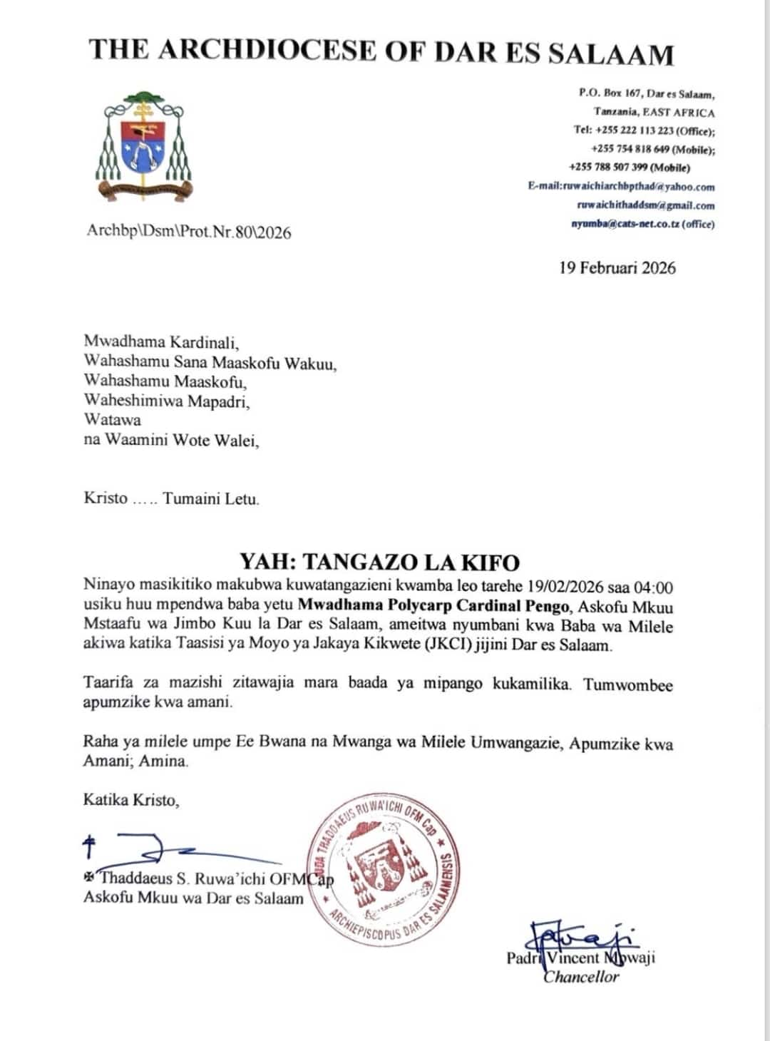 “Ninayo masikitiko makubwa kuwatangazieni kwamba leo tarehe 19/02/2026 saa 04:00 usıku huu mpendwa baba yetu Mwadhama Polyearp Cardinal Pengo, Askofu Mkuu Mstaatu wa Jımbo Kuu la Dar es Salaam, ameitwa nyumbani kwa Baba wa Milele akiwa katıka Tasısı ya Moyo ya Jakaya Kikwete (JKCI) jijini Dar es Salaam.