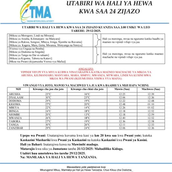 TMA yatoa utabiri wa hali ya hewa kwa saa 24 zijazo.