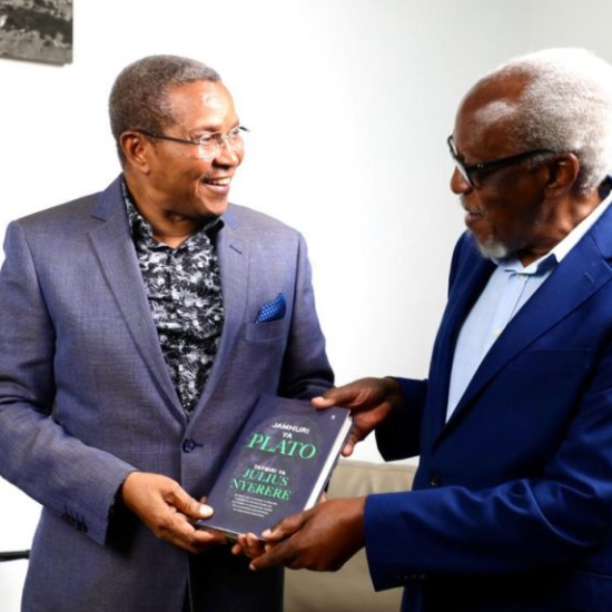 Rais Mstaafu wa Awamu ya Nne Dkt. Jakaya Mrisho Kikwete akipokea nakala ya kitabu “Jamhuri na Plato” kilichotafsiriwa na Hayati Baba wa Taifa Mwalimu Julius Kambarage Nyerere kutoka kwa Bw. Walter Bgoya, Mkurugenzi wa kampuni ya uchapishaji ya Mkuki na…
