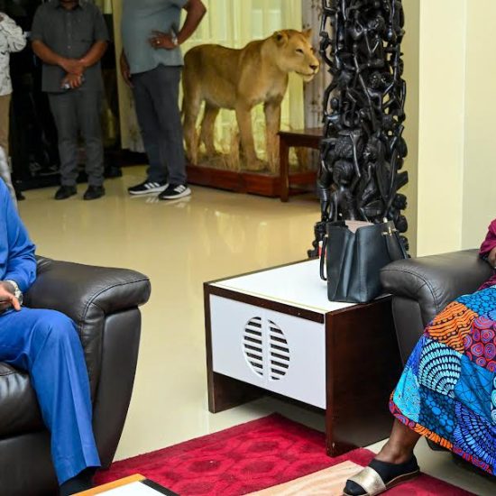 Makamu wa Rais wa Jamhuri ya Muungano wa Tanzania Balozi Dkt. Emmanuel Nchimbi akizungumza na Mama Janeth Magufuli ambaye ni mjane wa Rais wa Awamu ya Tano wa Jamhuri ya Muungano wa Tanzania Hayati Dkt. John Pombe Magufuli, wakati alipomtembelea…