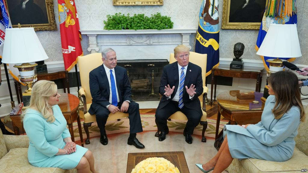 Rais Donald Trump akutana na Waziri Mkuu wa Israeli Benjamin Netanyahu. Kushoto ni mke wa Netanyahu, Sara na kulia ni mke wa Trump Melania wakiwa ikulu ya White House Machi 5, 2018 jijini Washington,DC.