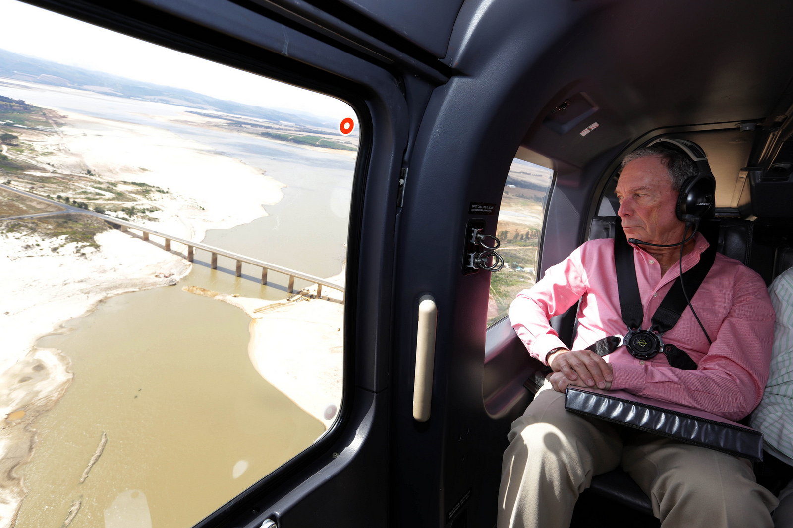 Balozi wa Umoja wa Mataifa wa Mabadiliko ya Tabianchi, Michael Bloomberg, akigagua namna bwawa la Theewaterskloof linaloathirika kwa kukauka kunakochangiwa na mabadiliko ya tabianchi.