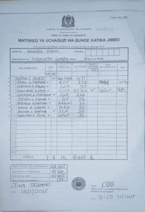 Matokeo rasmi yametangazwa na mkurugenzi wa uchaguzi jimbo la Songea mjini.