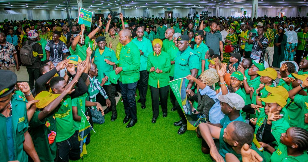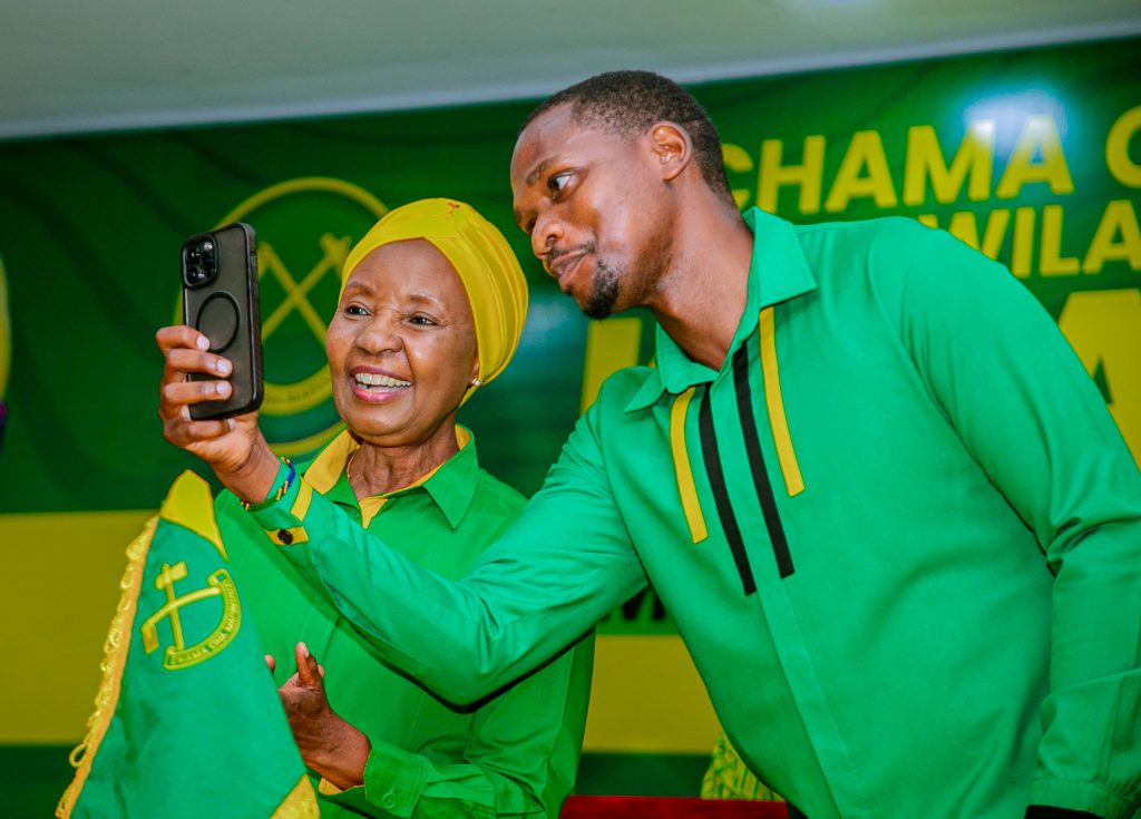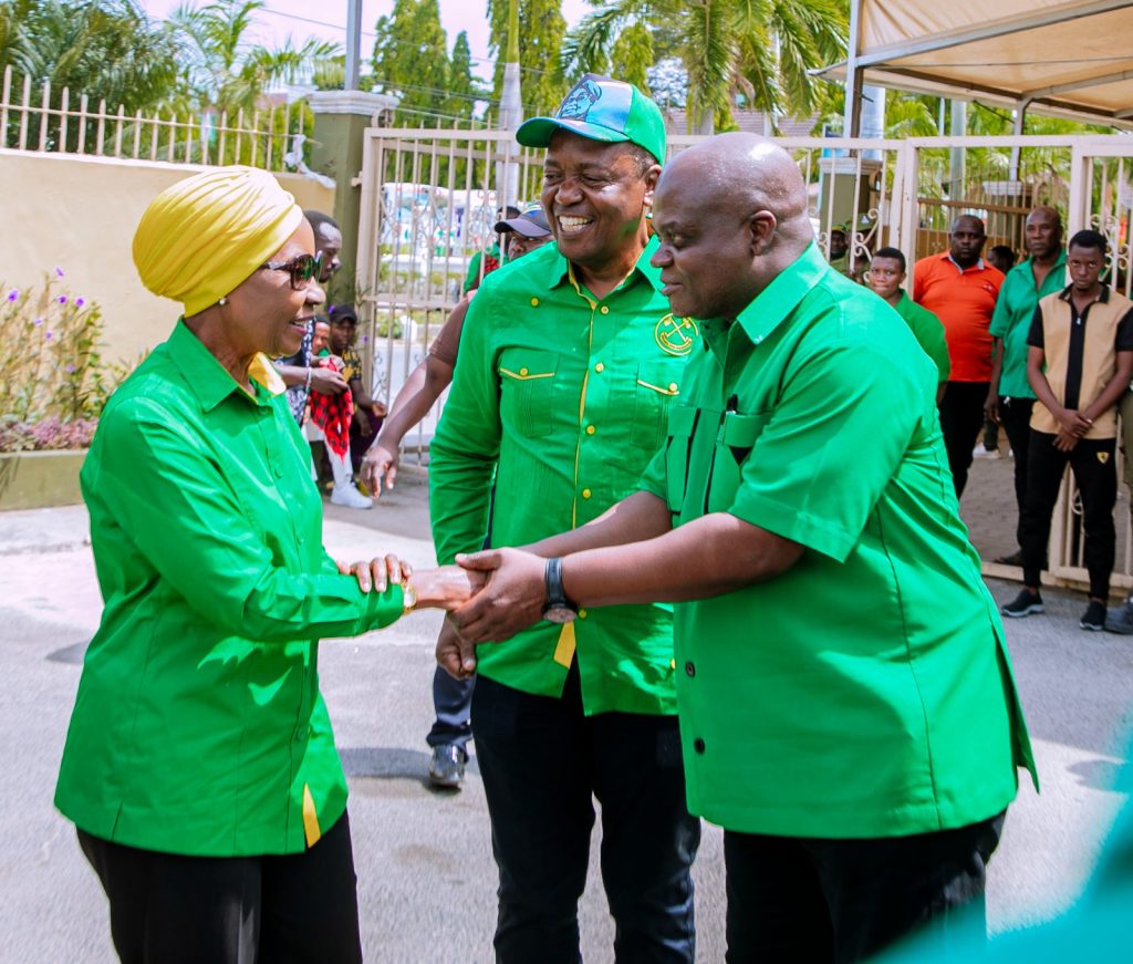 Katibu Mkuu wa Chama Cha Mapinduzi CCM Dkt. Asha Rose Migiro akisalimiana na Katibu wa NEC Itikadi, Siasa na Mafunzo CCM Bw. Kenani Kihongizi
