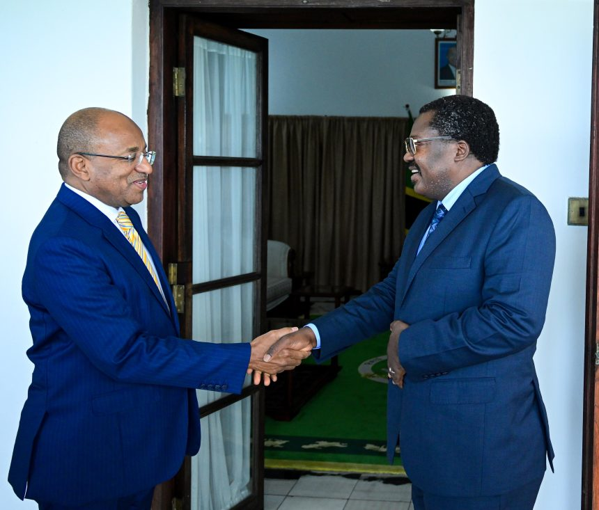 Makamu wa Rais wa Jamhuri ya Muungano wa Tanzania Mhe.Balozi Dkt. Emmanuel Nchimbi akisalimiana na Rais wa Zanzibar na Mwenyekiti wa Baraza la Mapinduzi Mhe. Dkt. Hussein Ali Mwinyi, wakati alipowasili Ikulu, Zanzibar leo tarehe 22 Novemba 2025.