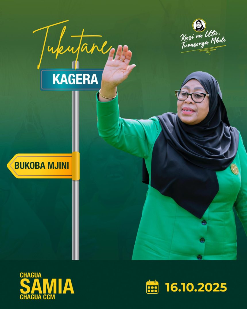 Mgombea Urais wa Jamhuri ya Muungano wa Tanzania kupitia Chama Cha Mapinduzi (CCM), Dkt. Samia Suluhu Hassan, leo anatarajiwa kufanya mkutano mkubwa wa kampeni mjini Bukoba, ikiwa ni mwendelezo wa ziara yake mkoani Kagera ambayo imepata mwitikio mkubwa wa wananchi.