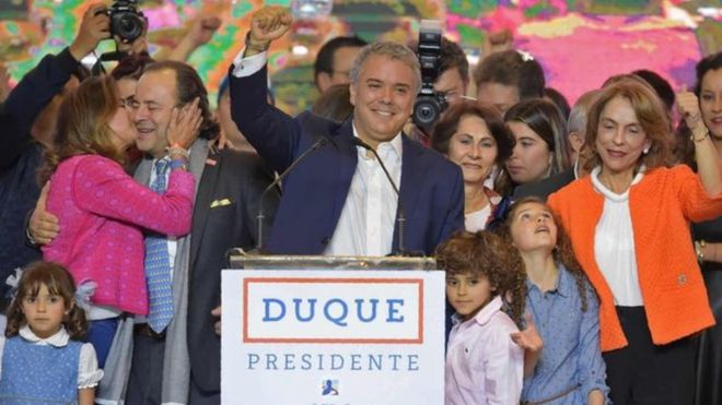 Mshindi wa uchaguzi wa urais nchini Colombia, Ivan Dukee amewahutubia wafuasi wake mjini Bogota. Bwana Dukee, mwenye umri wa miaka 41,aliahidi kufanyia marekebisho mkataba wa amani uliyofikiwa kati ya serikali na wapiganaji wa FARC.