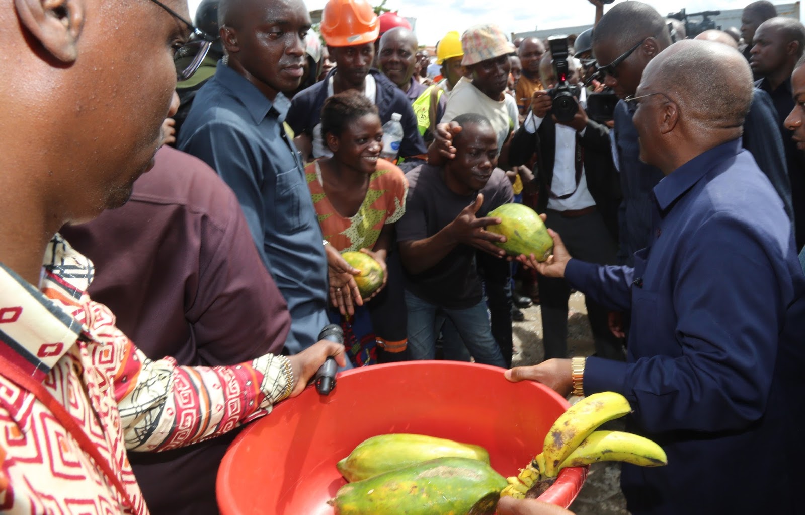 Rais wa Jamhuri ya Muungano wa Tanzania Dkt John Pombe Magufuli akigawa mapapai na ndizi kwa wananchi nje ya eneo lenye matanki ya kuhifadhia mafuta ya kula baada ya kushushwa melini alipofanya safari ya ghafla kukagua uingizwaji na ugawaji wa ulipiaji wa ushuru bidhaa hiyo kwenye bandari ya Dar es salaam leo Mei 15, 2018. Picha na IKULU