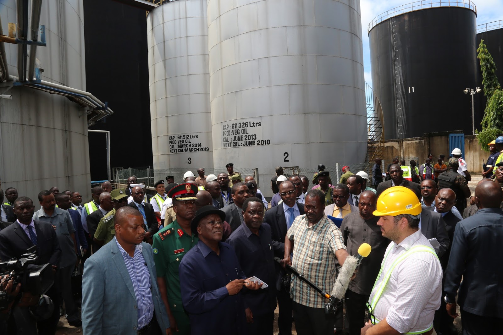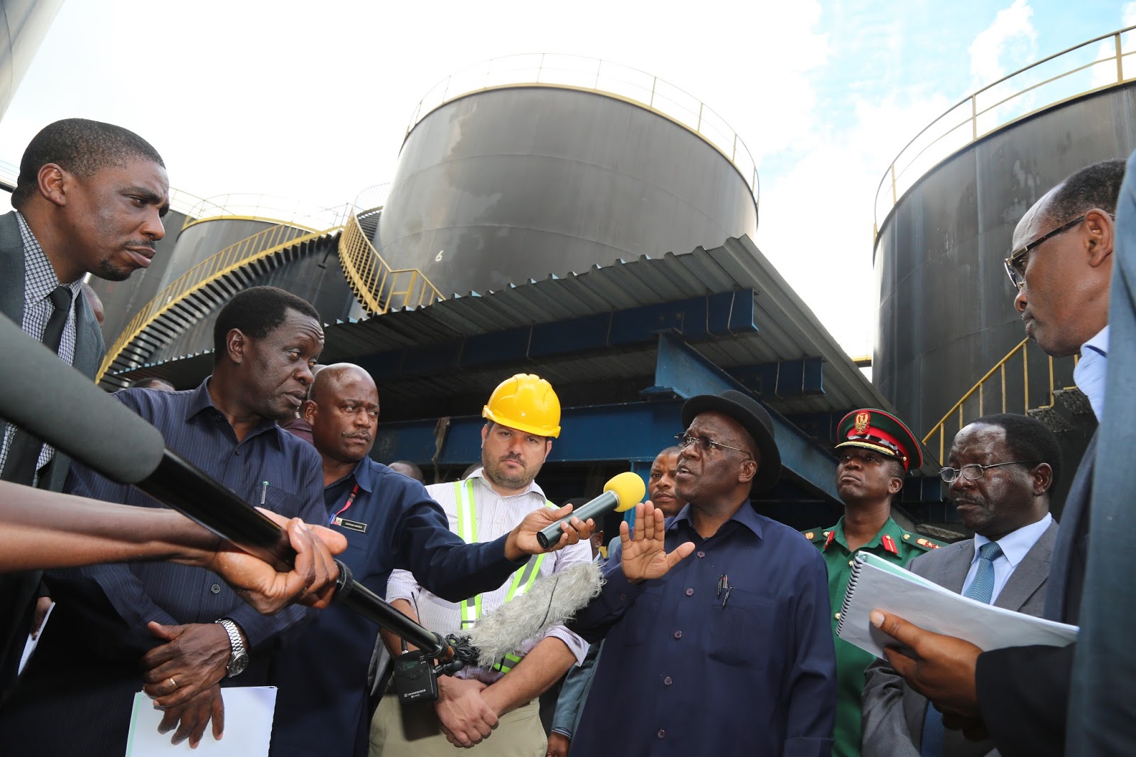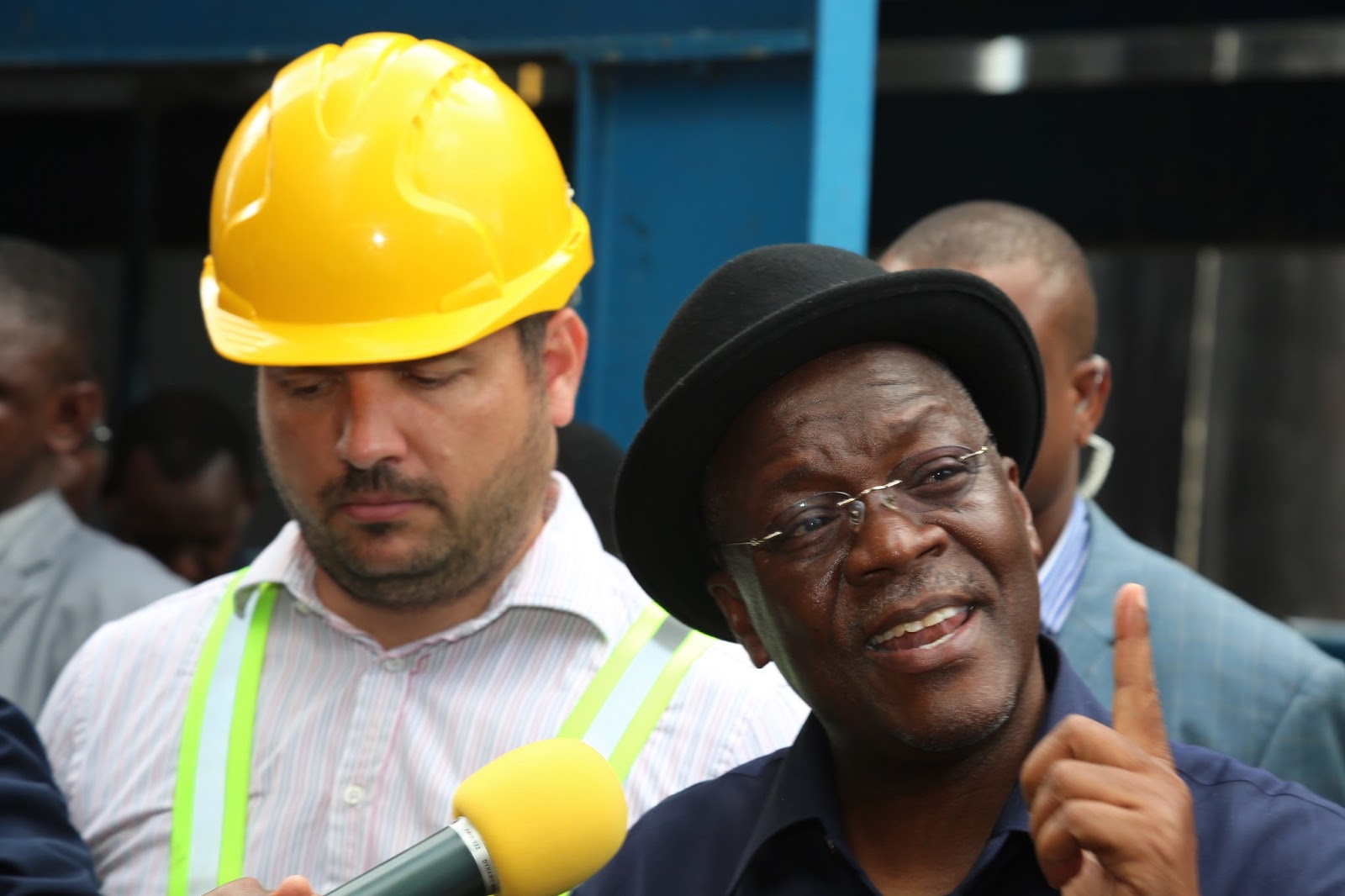 Rais wa Jamhuri ya Muungano wa Tanzania Dkt John Pombe Magufuli akitoa maelekezo na kuulia maswali alipowasili eneo lenye matanki ya kuhifadhia mafuta ya kula baada ya kushushwa melini alipofanya safari ya ghafla kukagua uingizwaji na ugawaji wa ulipiaji wa ushuru bidhaa hiyo kwenye bandari ya Dar es salaam leo Mei 15, 2018. Wa pili kushoto ni Waziri wa Viwanda, Biashara na Uwekezaji Mhe. Charles Mwijage, kushoto ni Katibu Mkuu Wizara ya Fedha na Mipango Mhe. Doto James, mwenye kofia ngumu ya njano ni Mkurugenzi wa kampuni ya uingizaji mafuta nchini TLS & VOT Bw. Claudio Ghirardi, Kulia ni Katibu Mkuu Wizara ya Viwanda na Biashara Profesa Olesante ole Gabriel anayefuatiwa na Mwenyekiti wa Kamati ya Rais ya Kuchunguza mafuta ya Kula na Naibu Katibu Mkuu Wizara ya Viwanda, Biashara na Uwekezaji Profesa Joseph R. Buchweishaija.