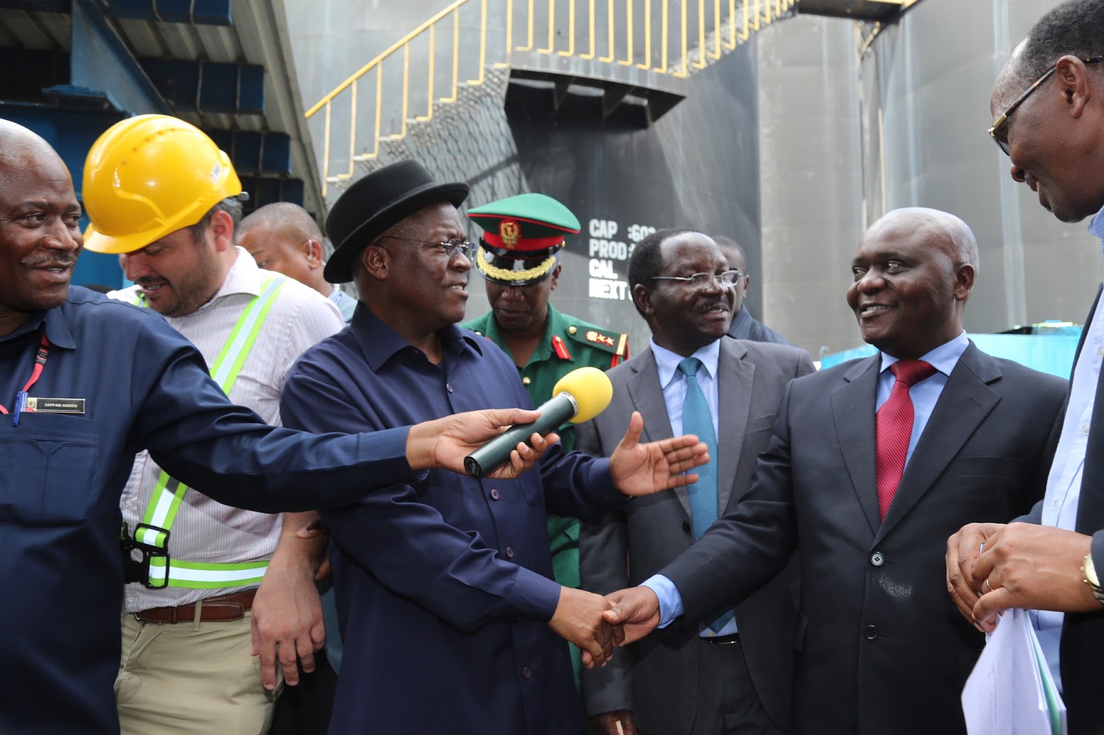 Rais wa Jamhuri ya Muungano wa Tanzania Dkt John Pombe Magufuli akitoa maelekezo na kuulia maswali alipowasili eneo lenye matanki ya kuhifadhia mafuta ya kula baada ya kushushwa melini alipofanya safari ya ghafla kukagua uingizwaji na ugawaji wa ulipiaji wa ushuru bidhaa hiyo kwenye bandari ya Dar es salaam leo Mei 15, 2018, Nyuma yake ni Mkurugenzi wa kampuni ya uingizaji mafuta nchini TLS & VOT Bw. Claudio Ghirardi,