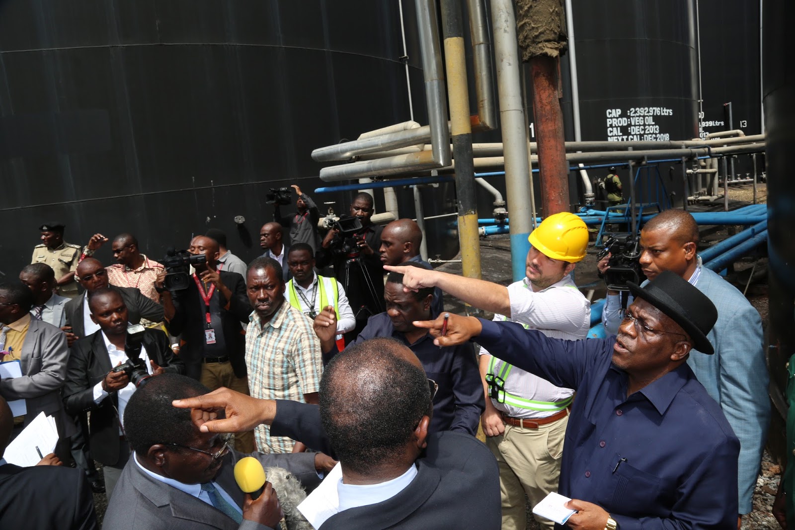 Rais wa Jamhuri ya Muungano wa Tanzania Dkt John Pombe Magufuli akitoa maelekezo na kuulia maswali alipowasili eneo lenye matanki ya kuhifadhia mafuta ya kula baada ya kushushwa melini alipofanya safari ya ghafla kukagua uingizwaji na ugawaji wa ulipiaji wa ushuru bidhaa hiyo kwenye bandari ya Dar es salaam leo Mei 15, 2018