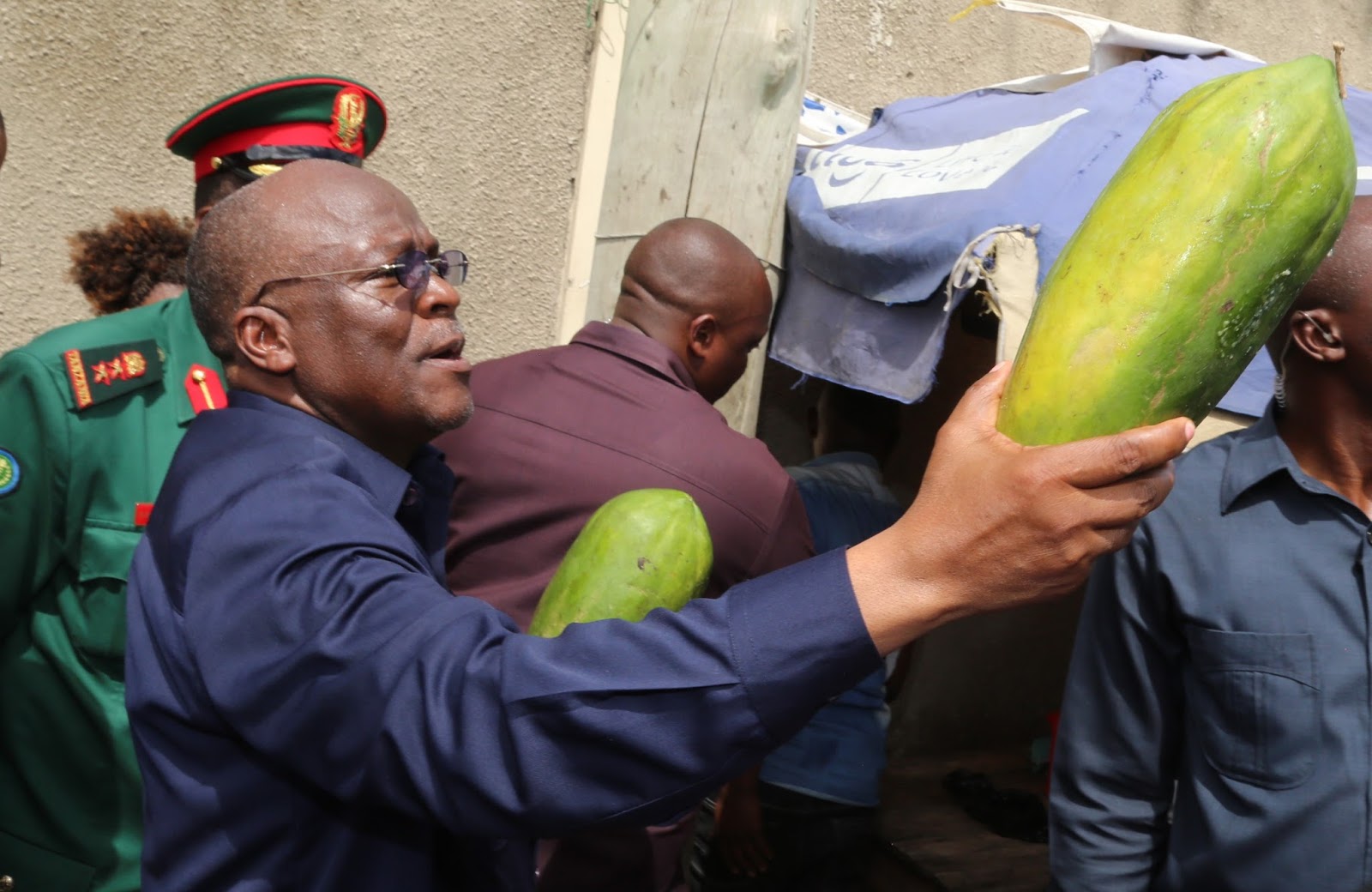 ais wa Jamhuri ya Muungano wa Tanzania Dkt John Pombe Magufuli akinunua mapapai na ndizi nje ya eneo lenye matanki ya kuhifadhia mafuta ya kula baada ya kushushwa melini alipofanya safari ya ghafla kukagua uingizwaji na ugawaji wa ulipiaji wa ushuru bidhaa hiyo kwenye bandari ya Dar es salaam leo Mei 15, 2018