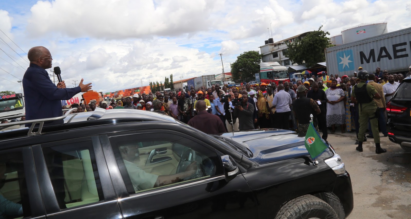 Rais wa Jamhuri ya Muungano wa Tanzania Dkt John Pombe Magufuli akisalimiana na wananchi eneo lenye matanki ya kuhifadhia mafuta ya kula baada ya kushushwa melini alipofanya safari ya ghafla kukagua uingizwaji na ugawaji wa ulipiaji wa ushuru bidhaa hiyo kwenye bandari ya Dar es salaam leo Mei 15, 2018