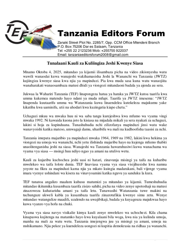 on Jukwaa la Wahariri latoa tamko JWTZ kuhusishwa na siasa