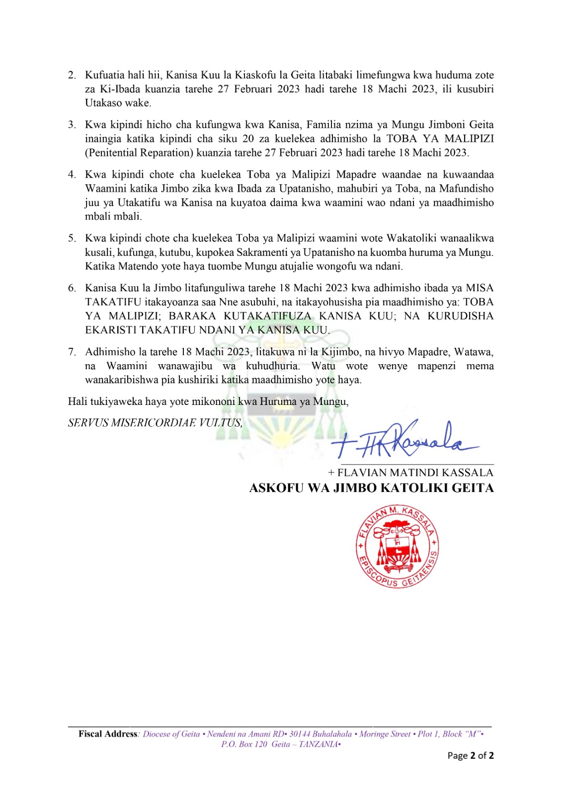 Kwa masikitiko makubwa na tumaini kubwa kwa Mungu, napenda kuwataarifu kwamba, huduma zote za ki-ibada na ki-Sakramenti katika Kanisa Kuu la Kiaskofu la Jimbo Katoliki la Geita zamesitishwa kuanzia leo tarehe 27 ya Mwezi Februari ya Mwaka wa Bwana 2023.