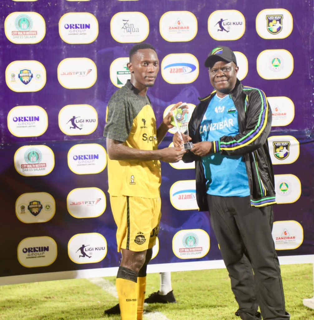 Katibu Mkuu Ofisi ya Makamu wa Rais Dkt. Richard Muyungi akikabidhi mfano wa hundi ya shilingi 1,000,000 kwa kiungo wa Yanga SC Dukr Abuya aliyechaguliwa kuwa nyota wa mchezo mara baada ya mechi ya nusu fainali ya Kombe la Muungano dhidi ya Yanga SC iliyochezwa Aprili 25, katika dimba la Amaan, Zanzibar. Zawadi hiyo imetolewa na Chuo cha Afya cha Zanzibar.