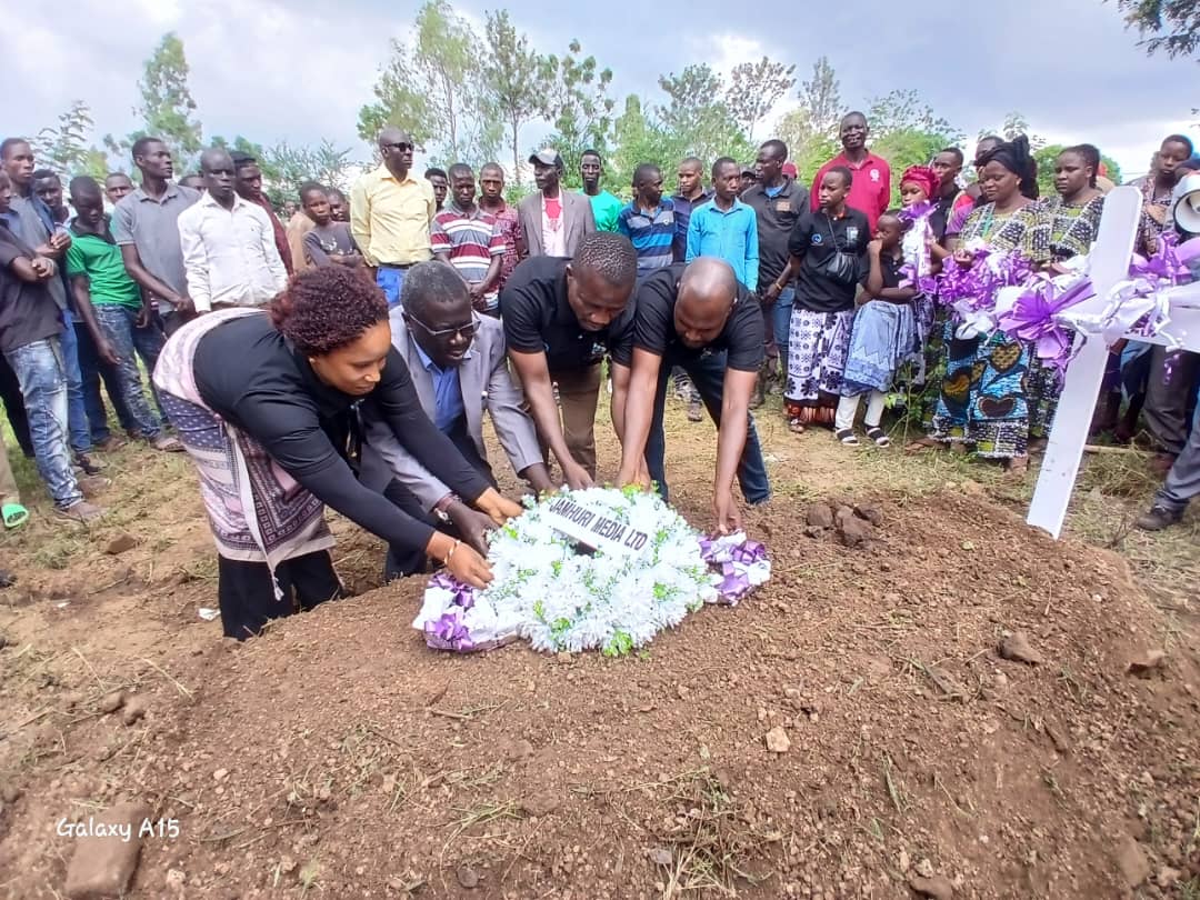 Mgurugenzi mwenza wa Kampuni ya Jamhuri Media, Manyerere Jackton ( wa pili kushoto) pamoja na wafanyakazi wa Jamhuri Media wakiweka shahada la maua kwa aliyekuwa mfanyakazi wa kampuni hiyo marehemu John Sabi Nzuryo.