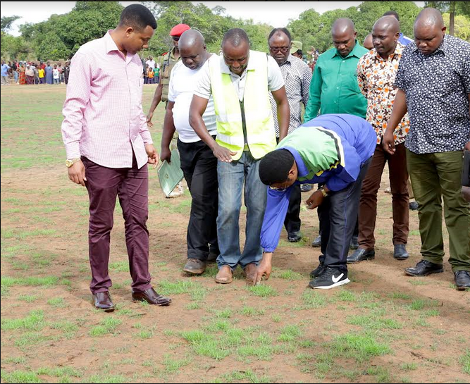 Waziri Mkuu, Kassim Majliwa akikagua nyasi zilizooteshwa kitalaam wakati alipshiriki katika ujenzi wa msingi wa jukwaa kuu la uwanja wa michezo unaojengwa kwenye eneo la Dodoma katika mai mdogo wa Ruangwa, Mei 25, 2018. (Picha na Ofisi ya Waziri Mkuu)