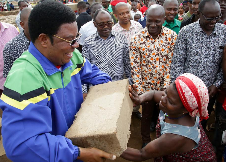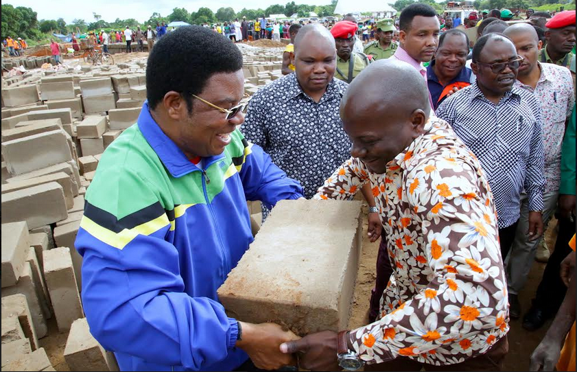 Waziri Mkuu, Kassim Majaliwa akimsaidia kubeba tofali, Bibi Mariam Bakari wakati aliposhiriki katika ujenzi wa wa msingi wa uwanaja wa michezo unaojengwa na wananchi kwenye eneo la Dodoma katika mji mdogo wa Rungwa mkoani Lindi, Mei 25, 2018. Wapili kushoto ni Mkuu wa Mkoa wa Lindi, Godfrey Zambi na wanne kushoto ni Mbunge wa Nachingwea, Hassan Masala. (Picha na Ofisi ya Waziri Mkuu)
