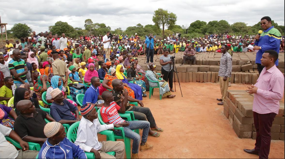 Waziri Mkuu, Kassim Majaliwa akizungumza baada ya kushiriki katika ujenzi wa msingi wa jukwaa kuu la uwanja wa michezo unaojengwa kwenye eneo la Dodoma katika mji mdogo wa Ruangwa mkaoani Lindi Mei 25, 2018.(Picha na Ofisi ya Waziri Mkuu)