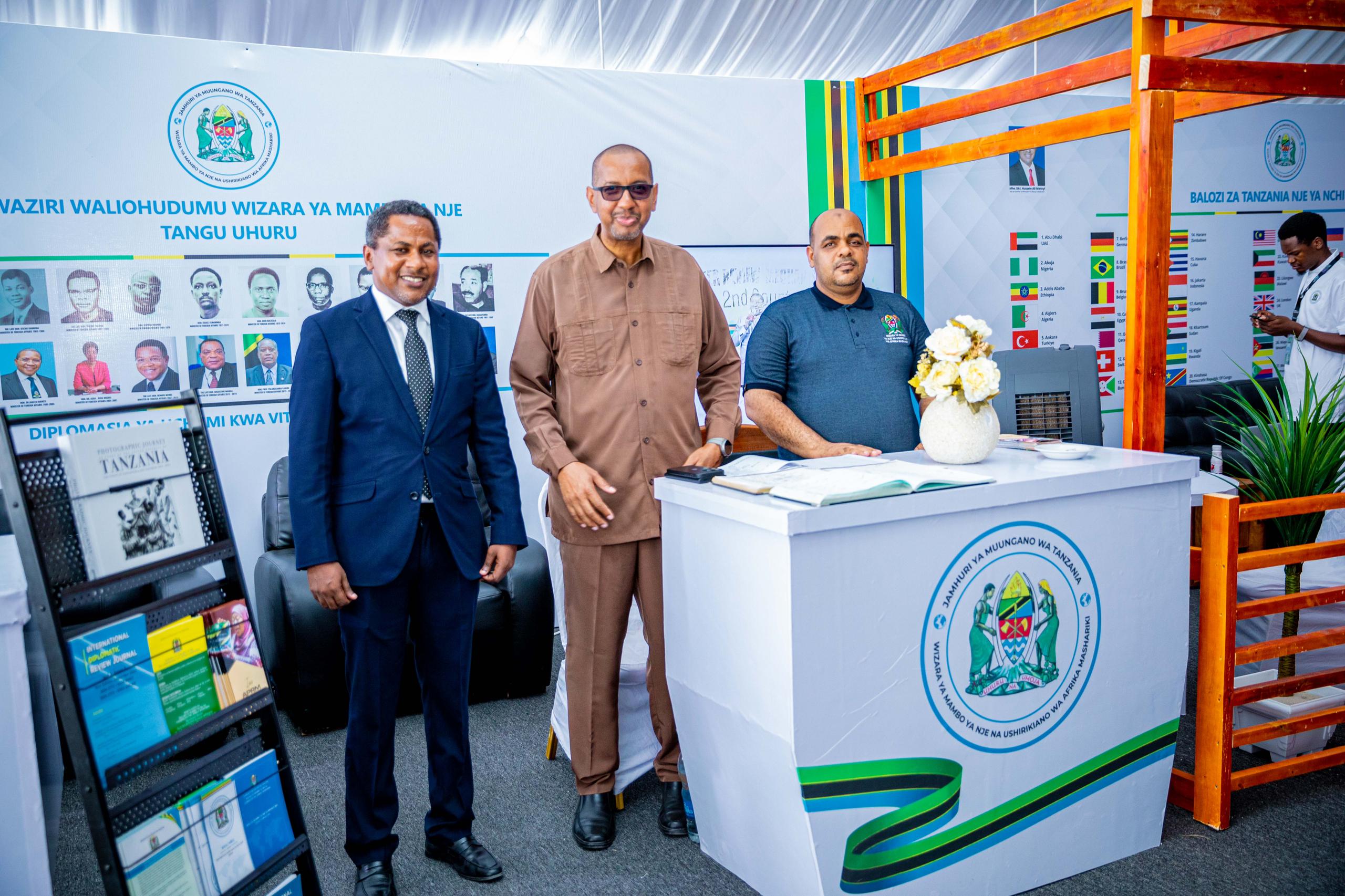 Katika banda la Wizara ya Mambo ya Nje na Ushirikiano wa Afrika Mashariki Mheshimiwa Abdullah Abdullah alipokelewa na Kaimu Mkurugenzi wa Afisi ya Mambo ya Nje Zanzibar Bw. Ally Ally na wafanyakazi wa Wizara walioko katika afisi hiyo.