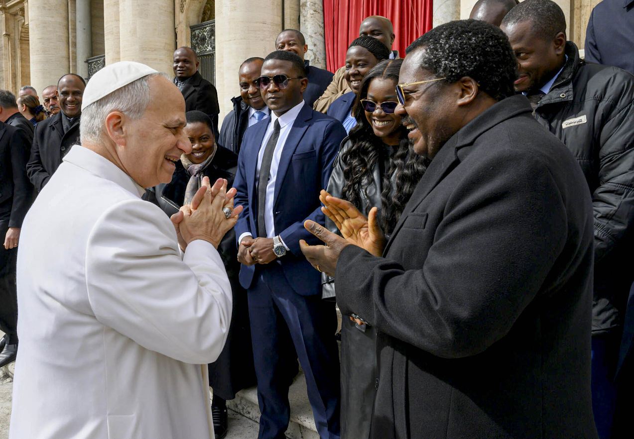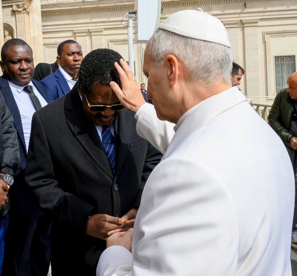 Makamu wa Rais wa Jamhuri ya Muungano wa Tanzania Mhe. Balozi Dkt. Emmanuel Nchimbi akifurahi jambo na Kiongozi Mkuu wa Kanisa Katoliki Duniani, Baba Mtakatifu Leo XIV, wakati wakiagana mara baada ya Ibada ya Hija iliyofanyika katika Uwanja wa Kanisa Kuu la Mtakatifu Petro – Vatican leo tarehe 01 Aprili 2026.