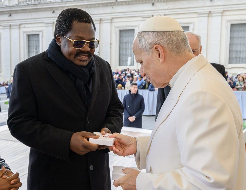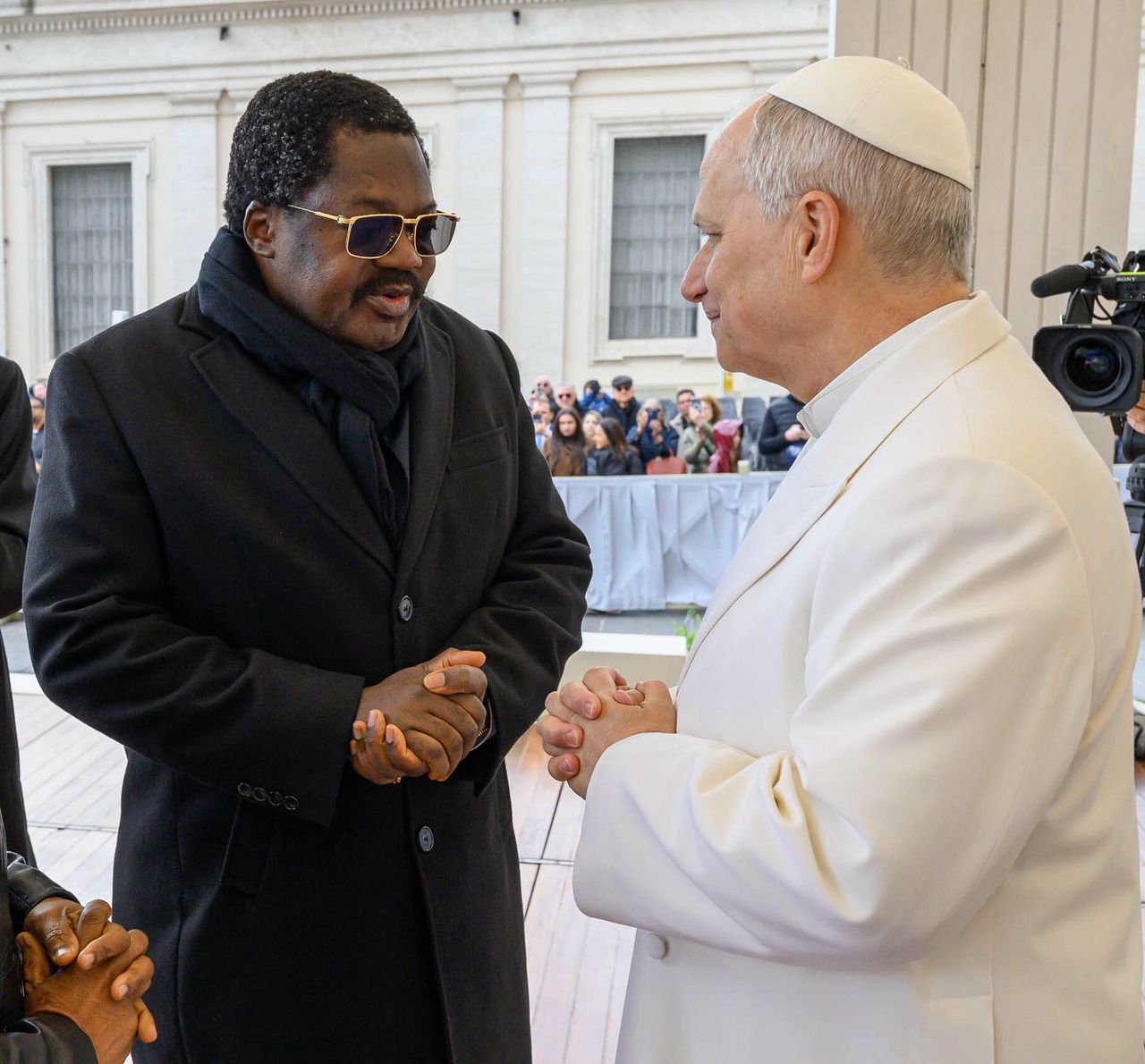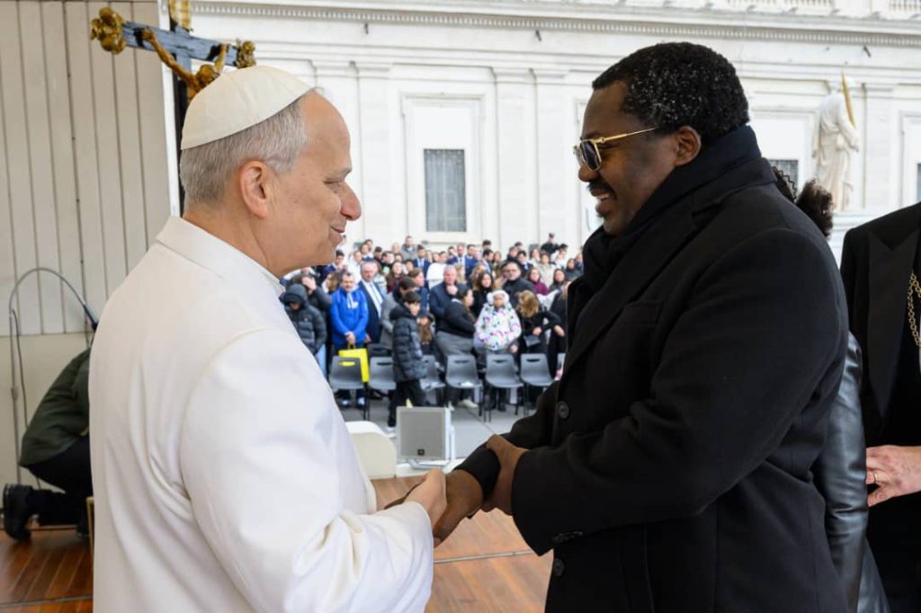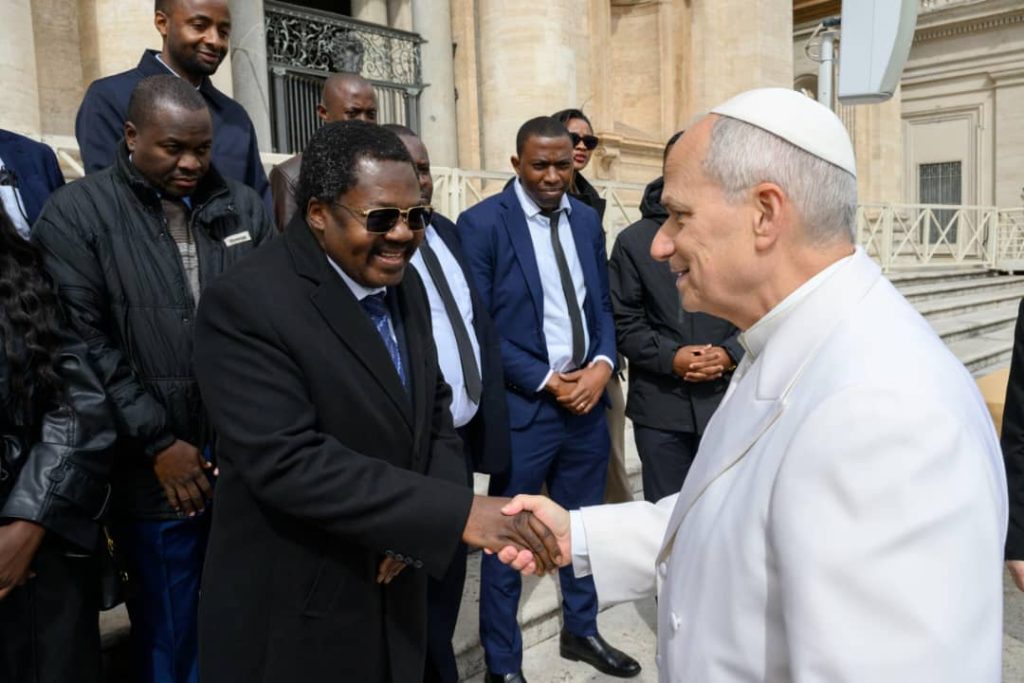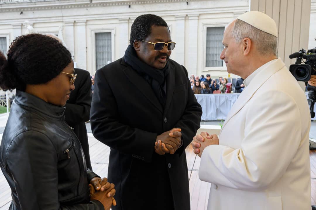 Makamu wa Rais wa Jamhuri ya Muungano wa Tanzania, Mhe. Balozi Dkt. Emmanuel Nchimbi, akisalimiana na Kiongozi Mkuu wa Kanisa Katoliki Duniani, Baba Mtakatifu Leo XIV, mara baada ya Ibada ya Hija iliyofanyika katika Uwanja wa Kanisa Kuu la Mtakatifu Petro – Vatican, leo tarehe 01.