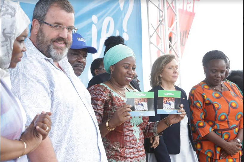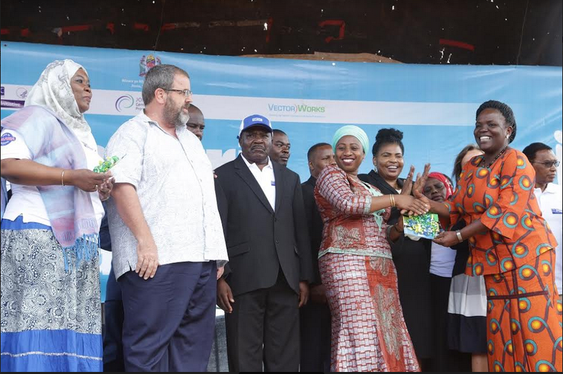 Waziri wa Afya Maendeleo ya jamii Jinsia wazee na watoto Ummy Mwalimu akionyesha rasmi Matokeo ya Utafiti wa Viashiria vya Malaria kwa Mwaka 2017 hapa nchini baada ya kuzindua wakati wa maadhimisho ya siku ya malaria ambayo yamefanyika Kasulu Mkoani Kigoma. Wengine ni Waziri wa Elimu Joyce Ndalichako – kwanza kulia, Balozi wa Uswizi ha Tanzania Florence Tinguell na Naibu Katibu Mkuu Wizara ya Afya Zanzibar Halima Maulid na Mwakilishi Mkazi wa USAID Tanzania Andy Karas.