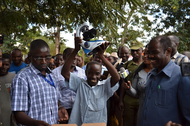 Mwenyekiti wa Kijiji cha Komkonga Bw.Omary Mngazija akishangilia kupokea hadubini ikiwa ni moja ya kifaa alichokabidhiwa na Mkuu wa Mkoa wa Tanga Mh. Martine Shigella mwenye suti ya kijivu kwaajili ya kuboresha huduma za Zahanati ya Komkonga.