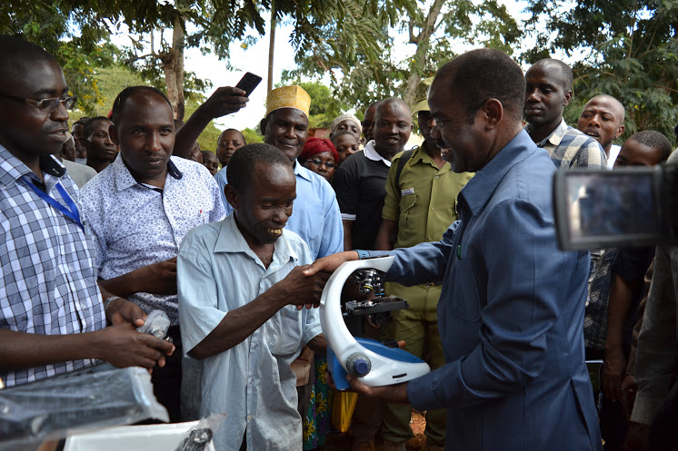 Mwenyekiti wa Kijiji cha Komkonga Bw.Omary Mngazija akishangilia kupokea hadubini ikiwa ni moja ya kifaa alichokabidhiwa na Mkuu wa Mkoa wa Tanga Mh. Martine Shigella mwenye suti ya kijivu kwaajili ya kuboresha huduma za Zahanati ya Komkonga.