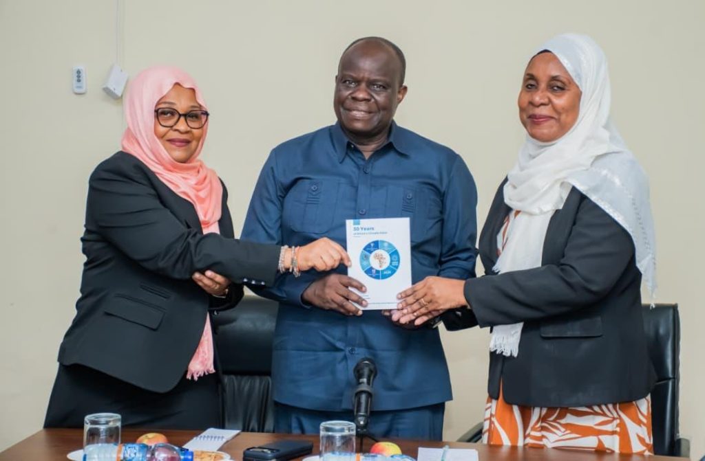 Katibu Mkuu Ofisi ya Makamu wa Rais, Dkt. Richard Muyungi (katikati) akimpatia zawadi ya nakala ya kitabu alichokiandika kinachohusu masuala ya mazingira na mabadiliko ya tabianchi kwa Katibu Mkuu Ofisi ya Makamu wa Kwanza wa Rais Zanzibar, Bi. Maryam Juma Abdalla wakati wa ziara yake aliyoifanya katika ofisi hiyo Januari 22, 2026 iliyolenga kujitambulisha na kuimarisha mashirikiano baina yao. Anayeshuhudia ni Mkurugenzi wa Mazingira Ofisi ya Makamu wa Kwanza wa Rais Zanzibar, Bi. Farhat Mbarouk.