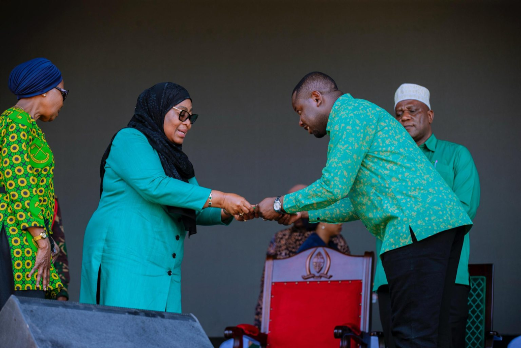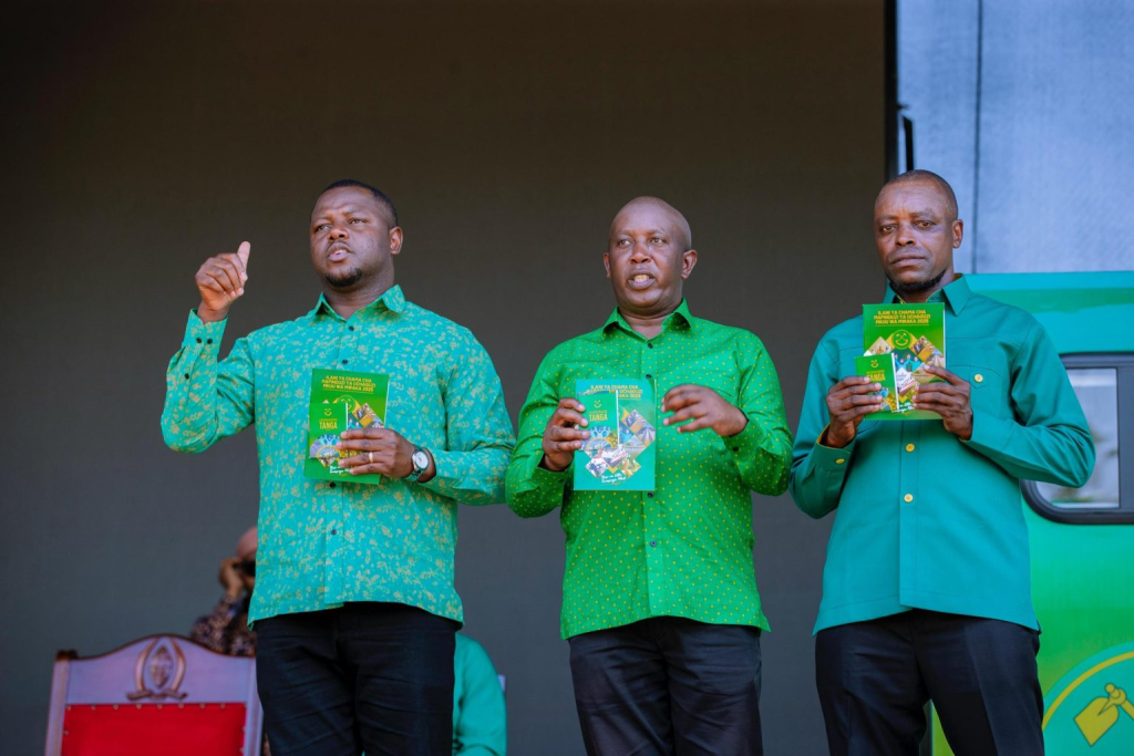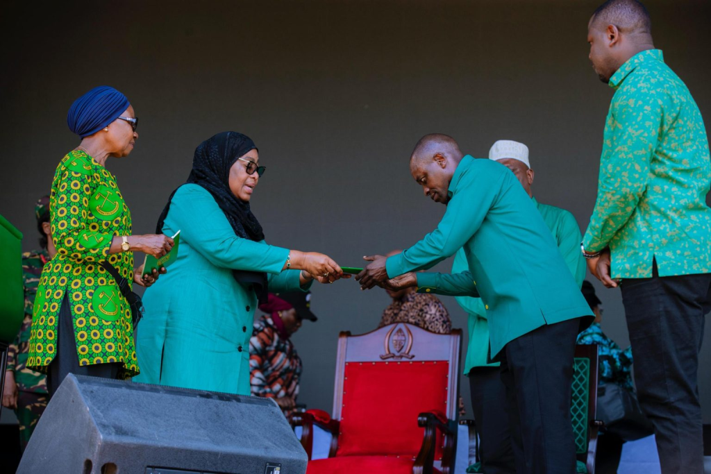 Mgombea wa nafasi ya Rais wa Jamhuri ya Muungano wa Tanzania na Mwenyekiti wa Chama cha Mapinduzi (CCM) Taifa Ndugu Dkt. Samia Suluhu Hassan akiwakabidhi Ilani ya Uchaguzi wagombea