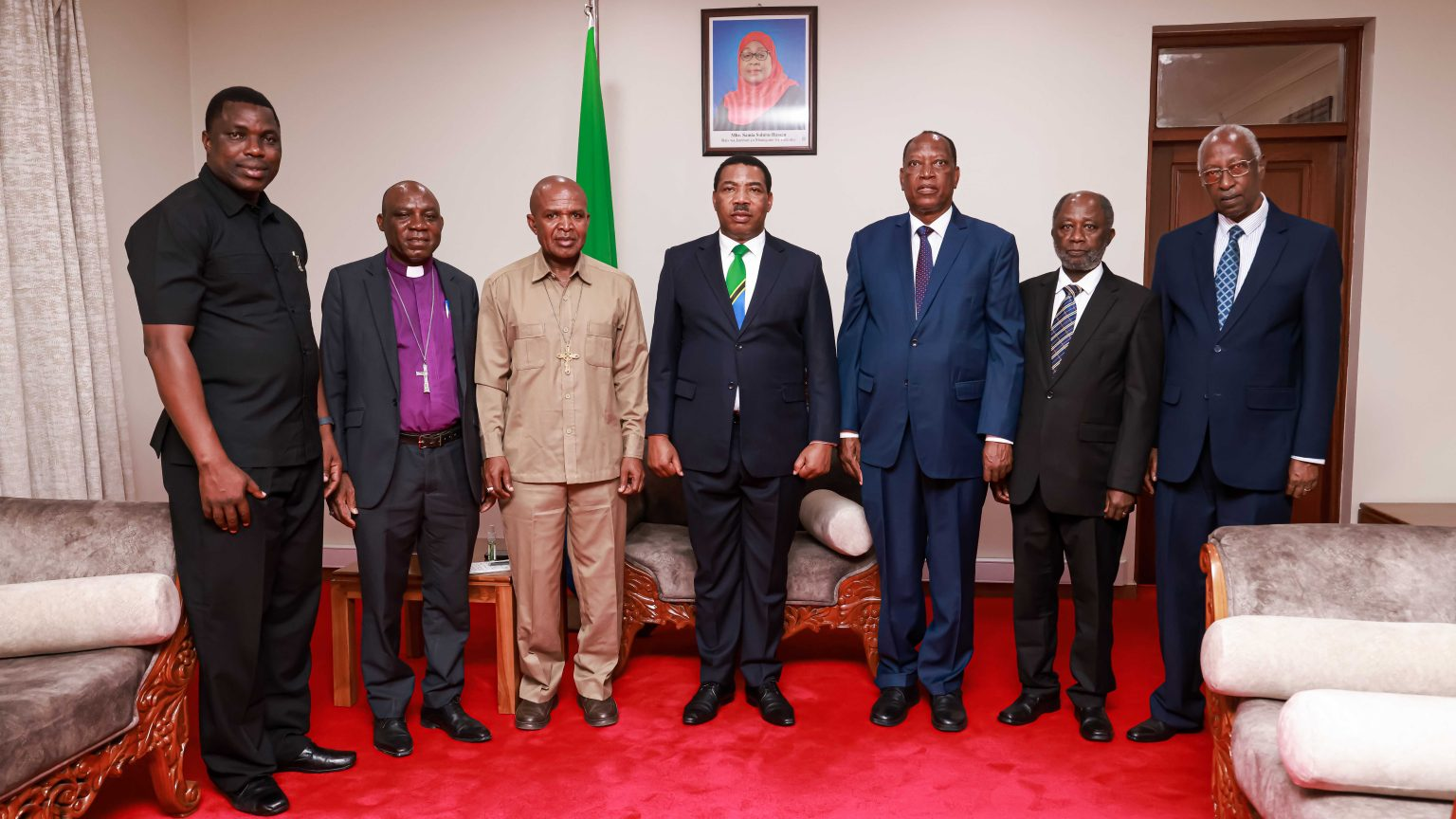 Waziri Mkuu, Dkt. Mwigulu Nchemba akiwa katika picha ya pamoja na Waziri wa Nchi Ofisi ya Rais Kazi Maalum, Profesa Palamagamba Kabudi (wa tatu kulia) pamoja na ongozi wa Juu wa Kanisa la Anglikana Tanzania baada ya mazungumzo yaliyofanyika ofisini kwa Waziri Mkuu, Mlimwa jijini Dodoma, Januari 19, 2026. Wengine kutoka kushoto ni Canon Dkt. George Otieno Lawi, Katibu Mkuu wa Kanisa Anglikana Tanzania, Askofu Dr Dickson Chilongani, Chancellor wa St John’s University of Tanzania na Askofu wa Dayosisi ya Central Tanganyika, Dodoma, Prof Chasmir Rubagumya Deputy Vice Chancellor Planning, Finance and Administration  St John’s University of Tanzania (Picha na Ofisi ya Waziri Mkuu)