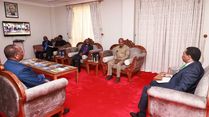 Waziri Mkuu, Dkt. Mwigulu Nchemba akizungumza na Askofu Mkuu wa Kanisa la Anglikana Tanzania, Dkt. Maimbo Mndolwa (wa pili kulia) na ujumbe wake katika ofisini kwa Waziri Mkuu, Mlimwa jijini Dodoma, Januari 19, 2026. (Wengine kutoka Kushoto ni Waziri wa Nchi Ofisi ya Rais Kazi Maalum, Profesa Palamagamba Kabudi (Picha na Ofisi ya Waziri Mkuu)