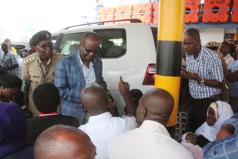 Waziri wa Ujenzi, Uchukuzi na Mawasiliano Profesa Makame Mbarawa (katikati) akiwasikiliza baadhi ya abiria wa Kivuko cha Magogoni alipofanya ukaguzi wa kivuko hicho leo jijini Dar es Salaam.