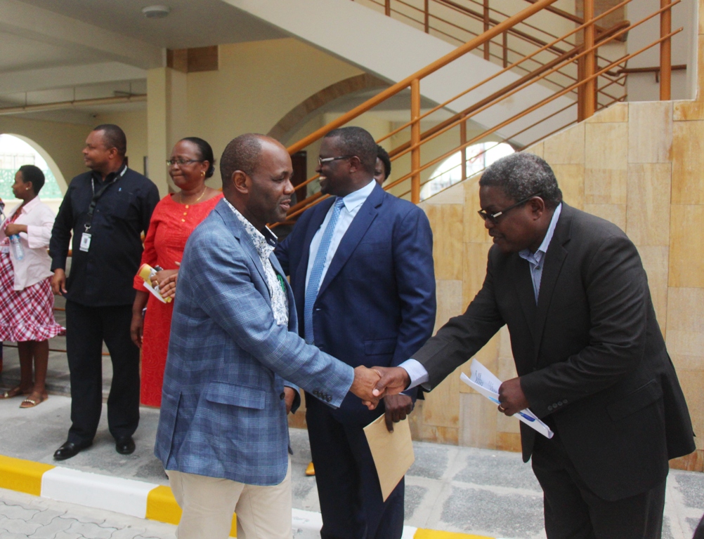 Waziri wa Ujenzi, Uchukuzi na Mawasiliano Profesa Makame Mbarawa (kushoto) kisalimiana na Naibu Mkurugenzi wa TPA (Miundombinu), Eng. Karim Mattaka (kulia) mara baada ya kuwasili kukagua ujenzi wa jengo jipya ‘One Stop Centre’ la Mamlaka ya Bandari nchini (TPA) leo jijini Dar es Salaam. Katikati ni Mkurugenzi Mkuu wa TPA, Eng. Kakoko.