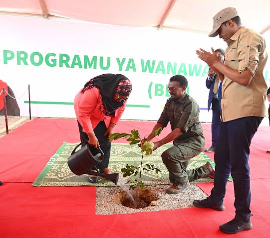 Rais wa Jamhuri ya Muungano wa Tanzania Mhe. Samia Suluhu Hassan akipanda mti katika eneo la Mradi wa Programu ya Kilimo cha Mashamba Makubwa ya pamoja (Block Farming) Chinangali Mkoani Dodoma tarehe 20 Machi, 2023.Rais wa Jamhuri ya Muungano wa Tanzania Mhe. Samia Suluhu Hassan akiwa na Waziri wa Kilimo Mhe. Hussein Bashe, Waziri Mkuu Mstaafu Mizengo Pinda, Spika wa Bunge la Jamhuri ya Muungano wa Tanzania Dkt. Tulia Ackson, Mkuu wa Mkoa wa Dodoma Mhe. Rosemary Senyamule pamoja na viongozi wengine wakati akikata utepe kuzindua Programu ya Kilimo cha Mashamba Makubwa ya pamoja (Block Farming) Chinangali Mkoani Dodoma tarehe 20 Machi, 2023.Rais wa Jamhuri ya Muungano wa Tanzania Mhe. Samia Suluhu Hassan akimkabidhi mfano wa Funguo MkurugenziDCIM\100MEDIA\DJI_0007.JPG