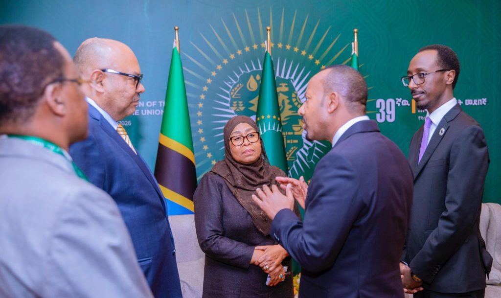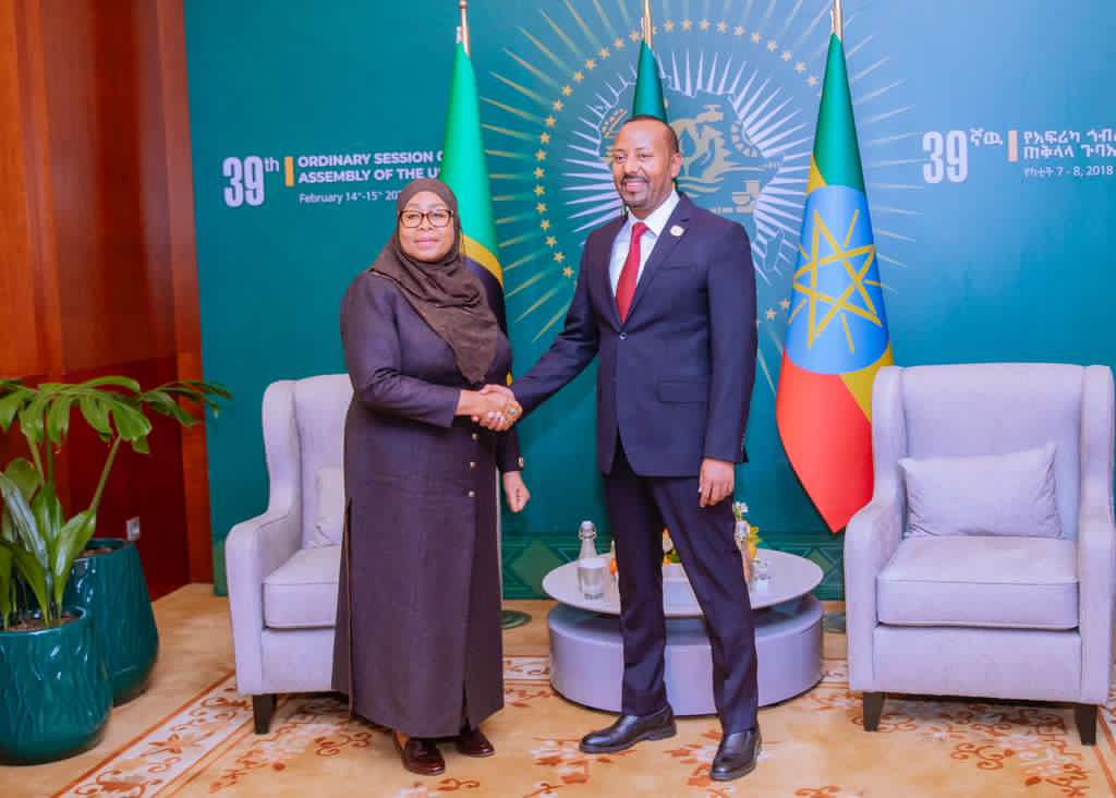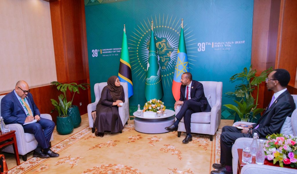 Rais wa Jamhuri ya Muungano wa Tanzania Mheshimiwa Dkt. Samia Suluhu Hassan akiwa kwenye mazungumzo na Waziri Mkuu wa Ethiopia Mheshimiwa Abiy Ahmed pembezoni mwa Mkutano wa Wakuu wa Nchi wa Umoja wa Afrika, tarehe 14 Februari, 2026 jijini Addis Ababa, Ethiopia.