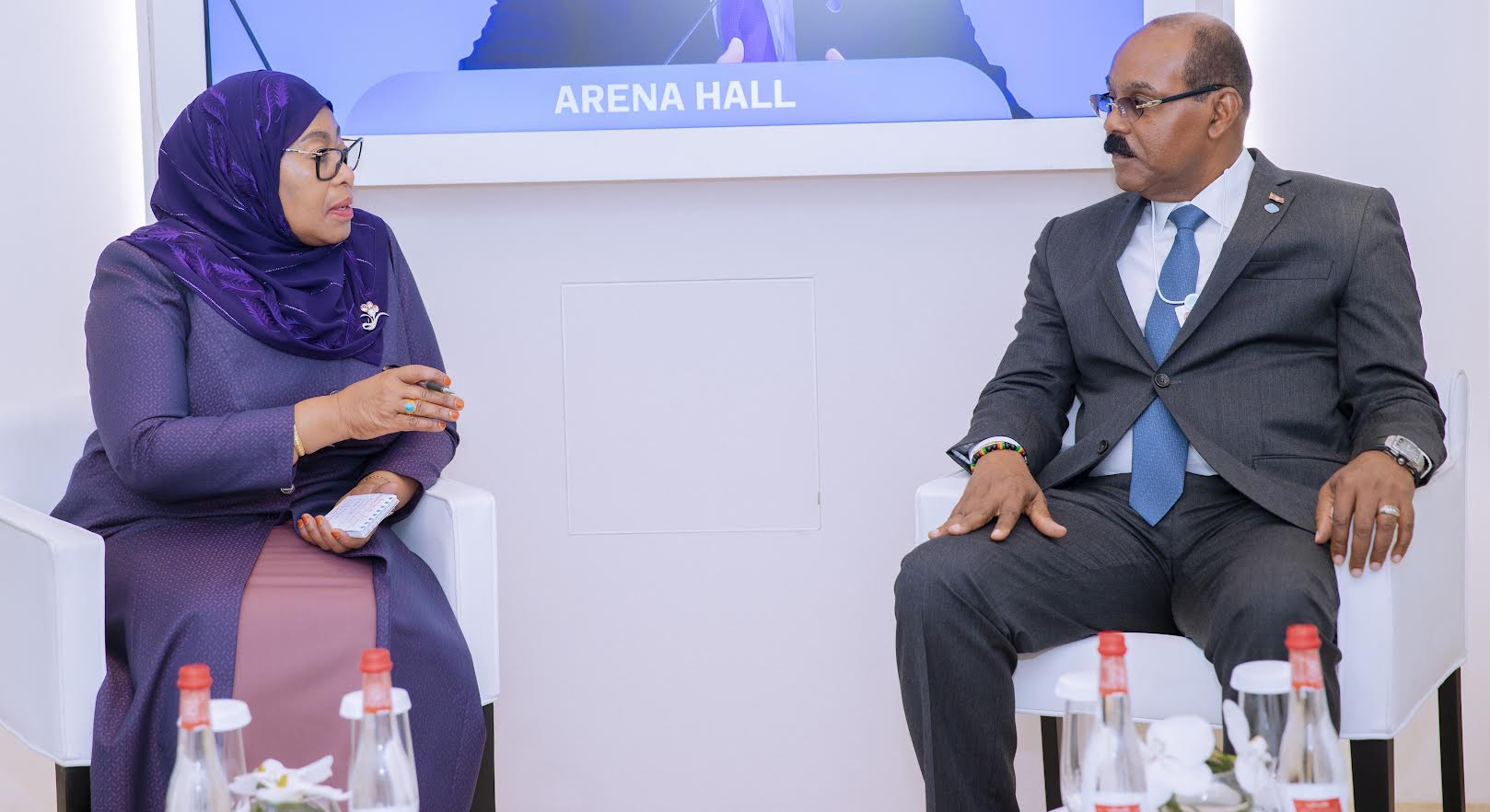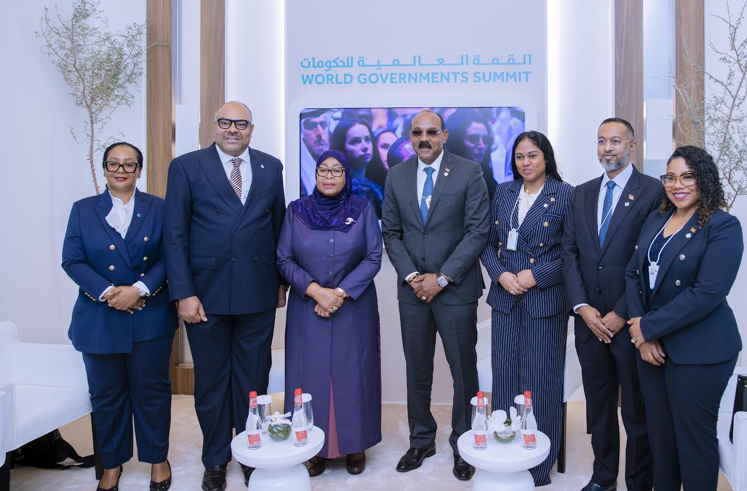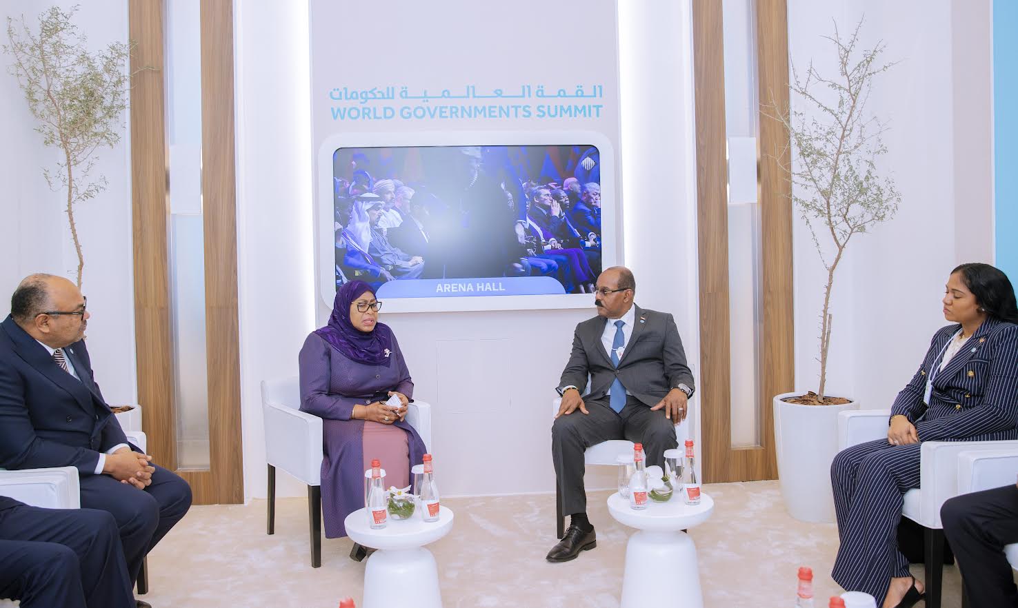 Rais wa Jamhuri ya Muungano wa Tanzania Mhe. Dkt. Samia Suluhu Hassan akizungumza na Waziri Mkuu wa Antigua na Barbuda Mhe. Gastone Browne pembezoni mwa mkutano wa Jukwaa la Serikali za Dunia (WGS2026), tarehe 3 Februari, 2026 Madinat Jumeirah, Dubai, Umoja wa Falme za Kiarabu (UAE). Pamoja na mambo mengine Viongozi hawa walikubaliana kushirikiana katika masuala mbalimbali yakiwemo kukuza utalii.