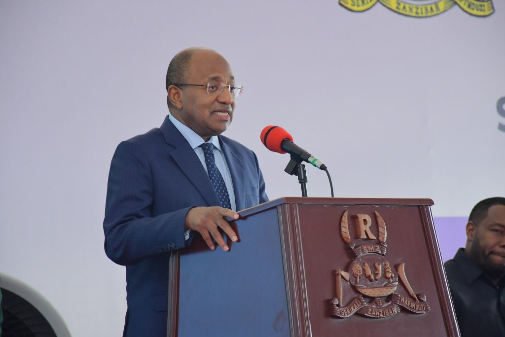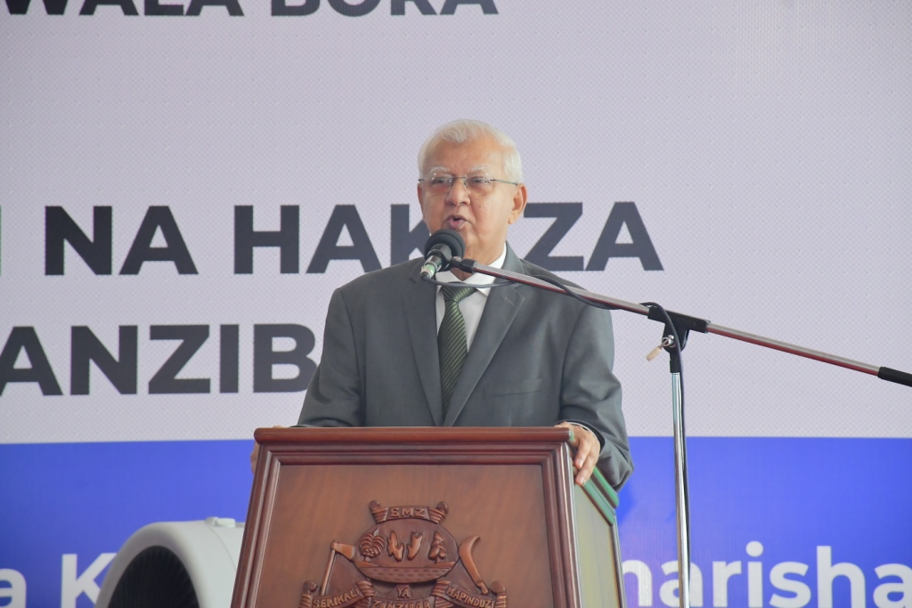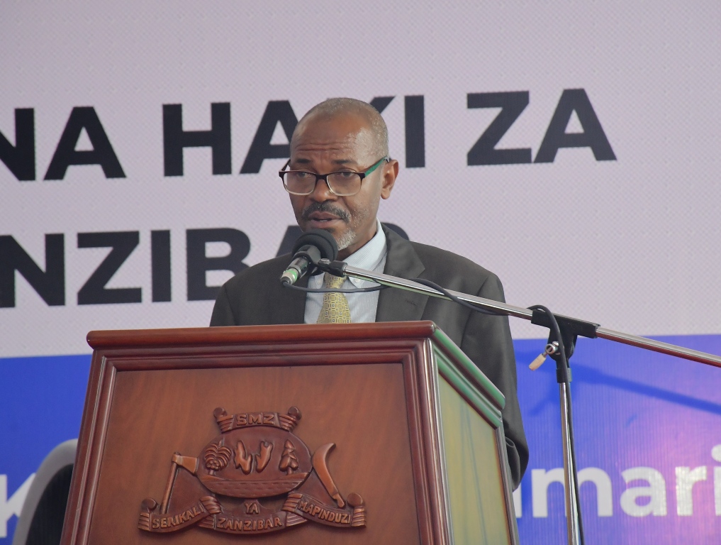 Waziri wa Nchi Ofisi ya Rais Katiba Sheria Utumishi na Utawala Bora Mw,Dk,Haroun Ali Suleiman akitoa hotuba ya Makaribisho kwa Mgeni Rasmi katika hafla ya Maadhimisho ya Siku ya Maadili na Haki za Binaadamu yaliofanyika katika Ukumbi wa Maonesho Nyamanzi Magharibi B Zanzibar.