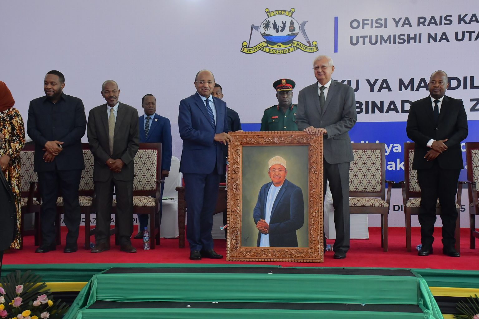 Rais wa Zanzibar na Mwenyekiti wa Baraza la Mapinduzi Dk,Hussein Ali Mwinyi katikati kushoto akikabidhiwa Zaadi ya Picha na Waziri wa Nchi Ofisi ya Rais Katiba Sheria Utumishi na Utawala Bora Mw,Dk,Haroun Ali Suleiman kwa Mchango wake Mkubwa katika kuhakikisha Maadili na Haki za Binaadamu zinatekelezwa Nchini katika hafla ya Siku ya Maadili na Haki za Binaadamu yaliofanyika katika Ukumbi wa Maonesho Nyamanzi Magharibi B Zanzibar.