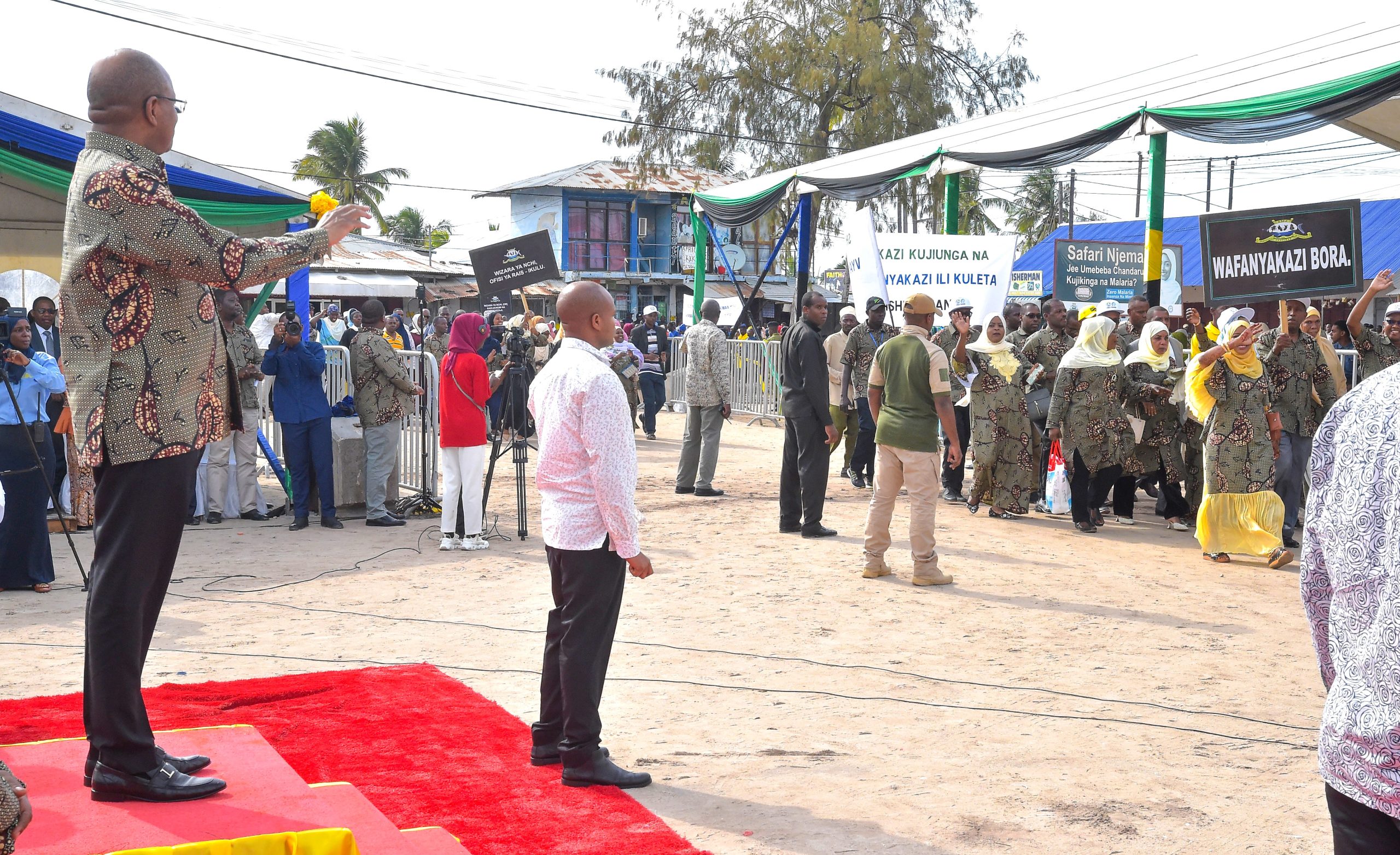 Rais wa Zanzibar na Mwenyekiti wa Baraza la Mapinduzi Mhe.Dk.Hussein Ali Mwinyi akiwasili katika viwanja vya mpira Nungwi Mkoa wa Kaskazini Unguja kwa ajili ya kupokea Maandamano ya Wafanyakazi kuadhimisha Siku ya Wafanyakazi Duniani Mei Mosi, Â yaliyofanyika katika Mkoa wa Kaskazini Unguja leo1-5-2023 na (kulia kwa kwa Rais) Makamu wa Pili wa Rais wa Zanzibar Mhe. Hemed Suleiman Abdulla na (kushoto kwa Rais) Waziri wa Nchi Ofisi ya Rais Kazi, Uchumi na Uwekezaji Zanzibar Mhe. Mudrik Ramadhan Soraga.(Picha na Ikulu)