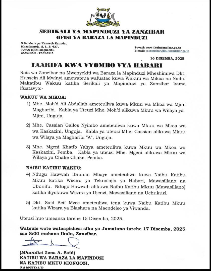 on Rais Mwinyi ateua ma – RC na Naibu Makatibu Wakuu