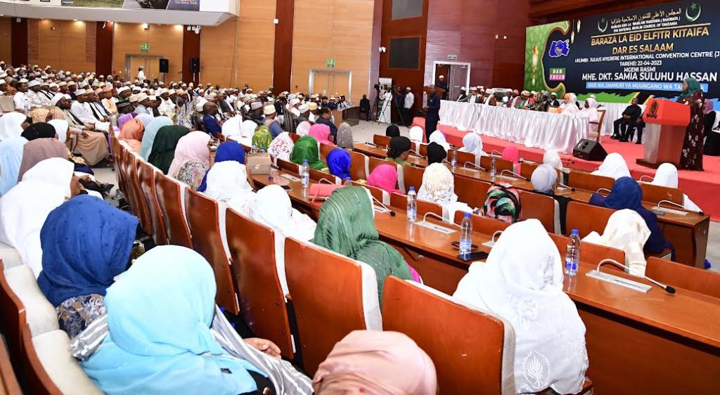 Rais wa Jamhuri ya Muungano wa Tanzania Mhe. Samia Suluhu Hassan akizungumza na Viongozi mbalimbali pamoja na Waumini wa Dini ya Kiislamu kwenye Baraza la Eid El-Fitr ambalo Kitaifa limefanyika katika Kituo cha Mikutano cha Kimataifa cha Julius Nyerere (JNICC) Jijini Dar es Salaam tarehe 22 Aprili, 2023. Rais wa Jamhuri ya Muungano wa Tanzania Mhe. Samia Suluhu Hassan akisalimiana na Mufti na Sheikh Mkuu wa Tanzania Dkt. Sheikh Abubakar Zubeir bin Ally mara baada ya kuwasili katika Kituo cha Mikutano cha Kimataifa cha Julius Nyerere (JNICC) Jijini Dar es Salaam kwa ajili ya kuhudhuria Baraza la Eid El-Fitr tarehe 22 Aprili, 2023. Wengine katika picha ni Kaimu Sheikh wa Mkoa wa Dar es Salaam Walid Alhad Omar pamoja na Mwenyekiti wa Jumuiya ya Wanawake wa Kiislamu Mama Shamim Khan Viongozi mbalimbali pamoja na Waumini wa Dini ya Kiislamu wakiwa kwenye Baraza la Eid ambalo Kitaifa limefanyika Kituo cha Mikutano cha Kimataifa cha Julius Nyerere (JNICC) Jijini Dar es Salaam tarehe 22 Aprili, 2023. Rais wa Jamhuri ya Muungano wa Tanzania Samia Suluhu Hassan akiwa pamoja na viongozi mbalimbali kwenye Baraza la Eid El-Fitr ambalo Kitaifa limefanyika Kituo cha Mikutano cha Kimataifa cha Julius Nyerere (JNICC) Jijini Dar es Salaam tarehe 22 Aprili, 2023.