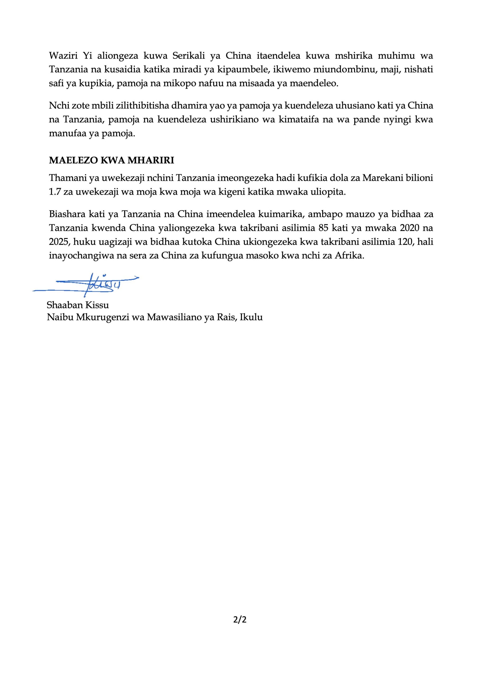 Tanzania, China zakubaliana kuendeleza ushirikiano wa kimkakati